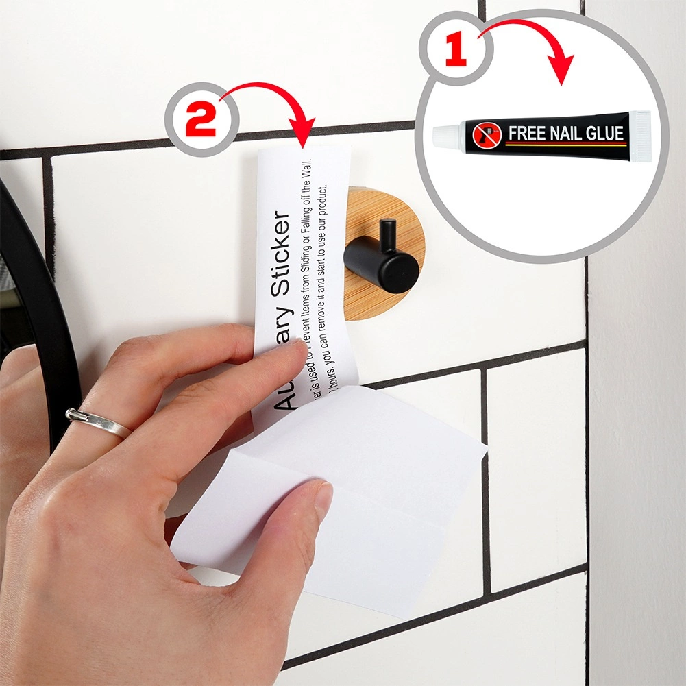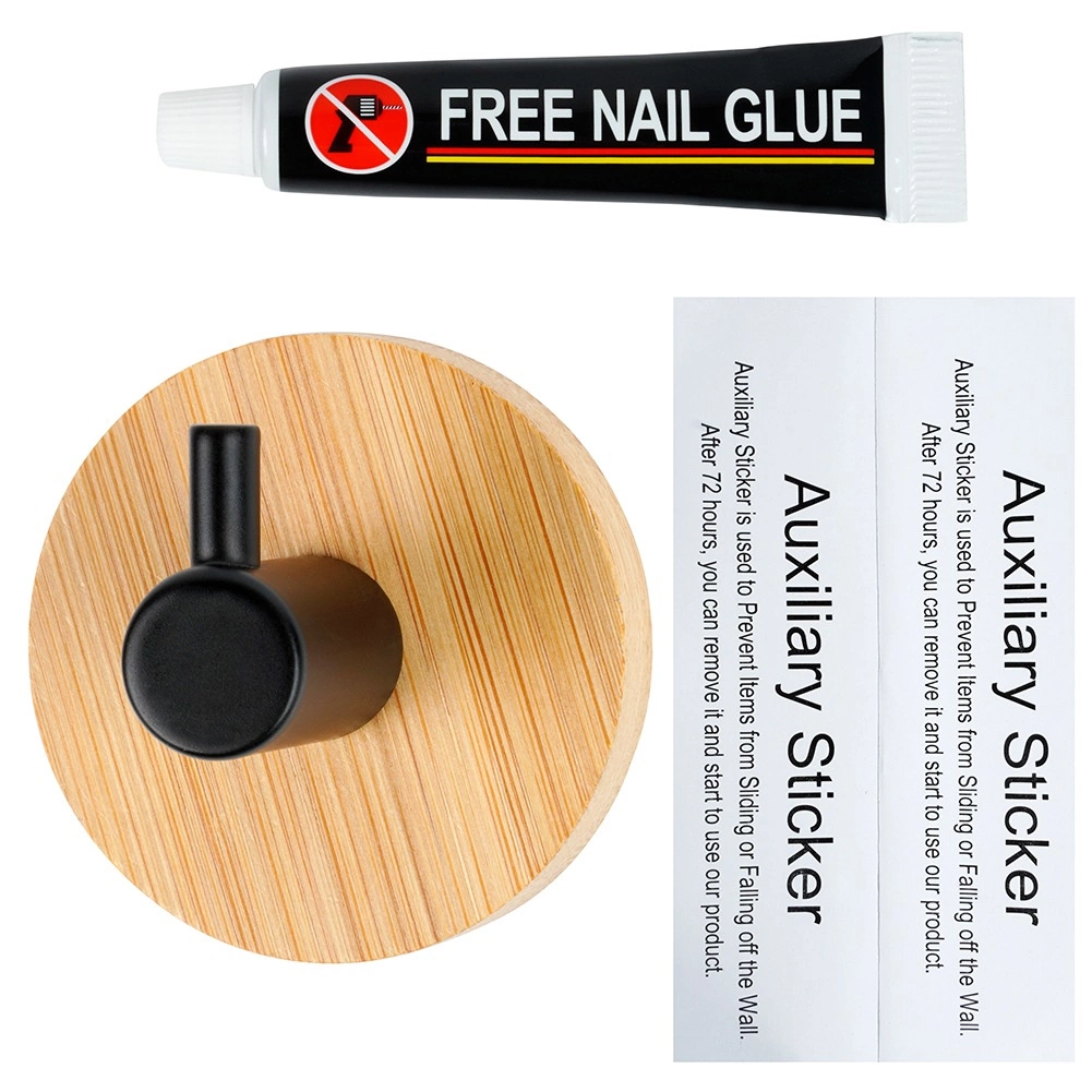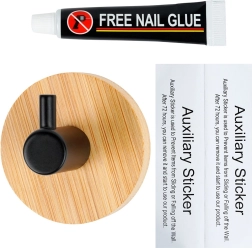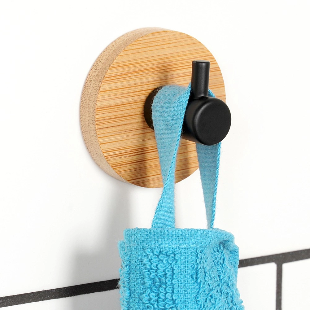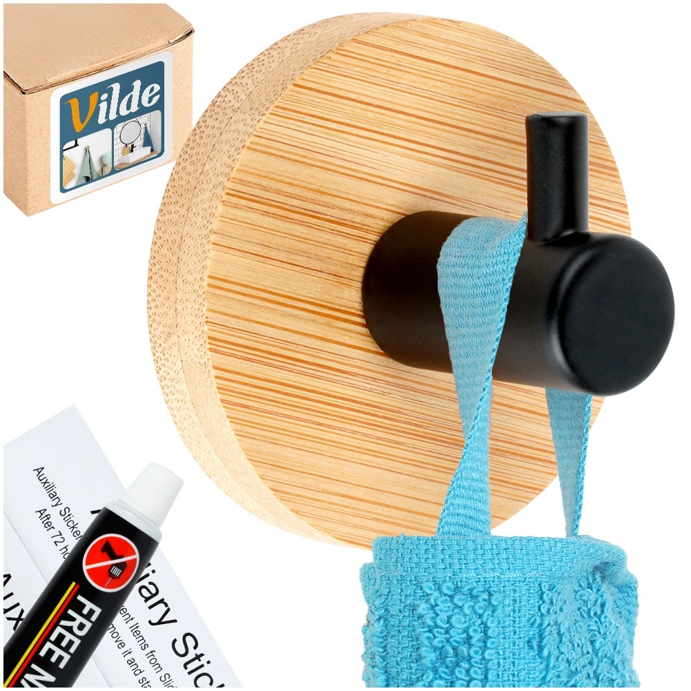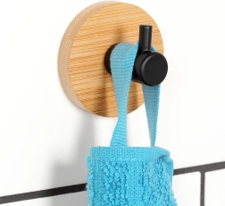 Stilīgs sienas āķis ar bambusa pamatni un melnu metāla tapu ikdienas lietošanai vannasistabā, virtuvē un priekštelpā. Uzstādīšana bez urbšanas, izmantojot līmi un pašlīmējošas uzlīmes, nodrošina stingru un ilgnoturīgu fiksāciju. Kompaktie izmēri 5 × 3,5 cm, mūsdienīgs dizains un universāls pielietojums dvieļiem, lupatiņām, halātiem un aksesuāriem.
