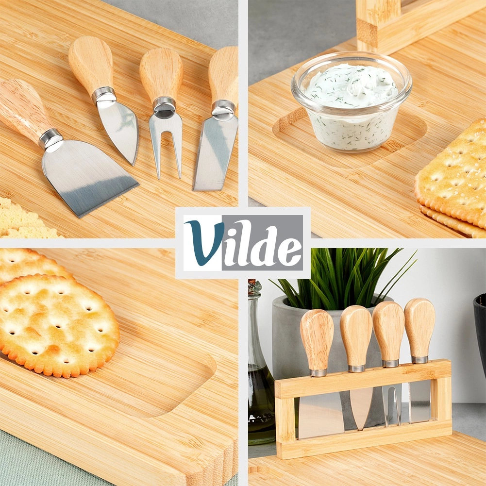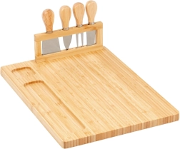 Stilīgs komplekts siera cienītājiem: bambusa dēlītis ar integrētu statīvu un četriem nerūsējošā tērauda instrumentiem. Ideāli piemērots griešanai, porcionēšanai un pasniegšanai sieriem, gaļas izstrādājumiem un našķiem. Dabīgais bambuss ir izturīgs pret mitrumu, ātri žūst un neuzsūc smakas. Lieliski der mājas lietošanai, ballītēm un vīna vakariem.
