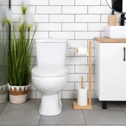 Elegantais bambusa tualetes papīra statīvs 70 cm augstumā piedāvā turētāju aktīvajam rullim un glabātuvi līdz pat 3 rezerves ruļļiem. Pateicoties stabilai kvadrātveida pamatnei 19 × 19 cm, tas ir stingrs un drošs, turklāt nepieprasa urbšanu un to ir viegli pārvietot. Dabīgais bambuss piešķir vannas istabai mūsdienīgu, dekoratīvu izskatu un taupa vietu arī mazākās telpās.