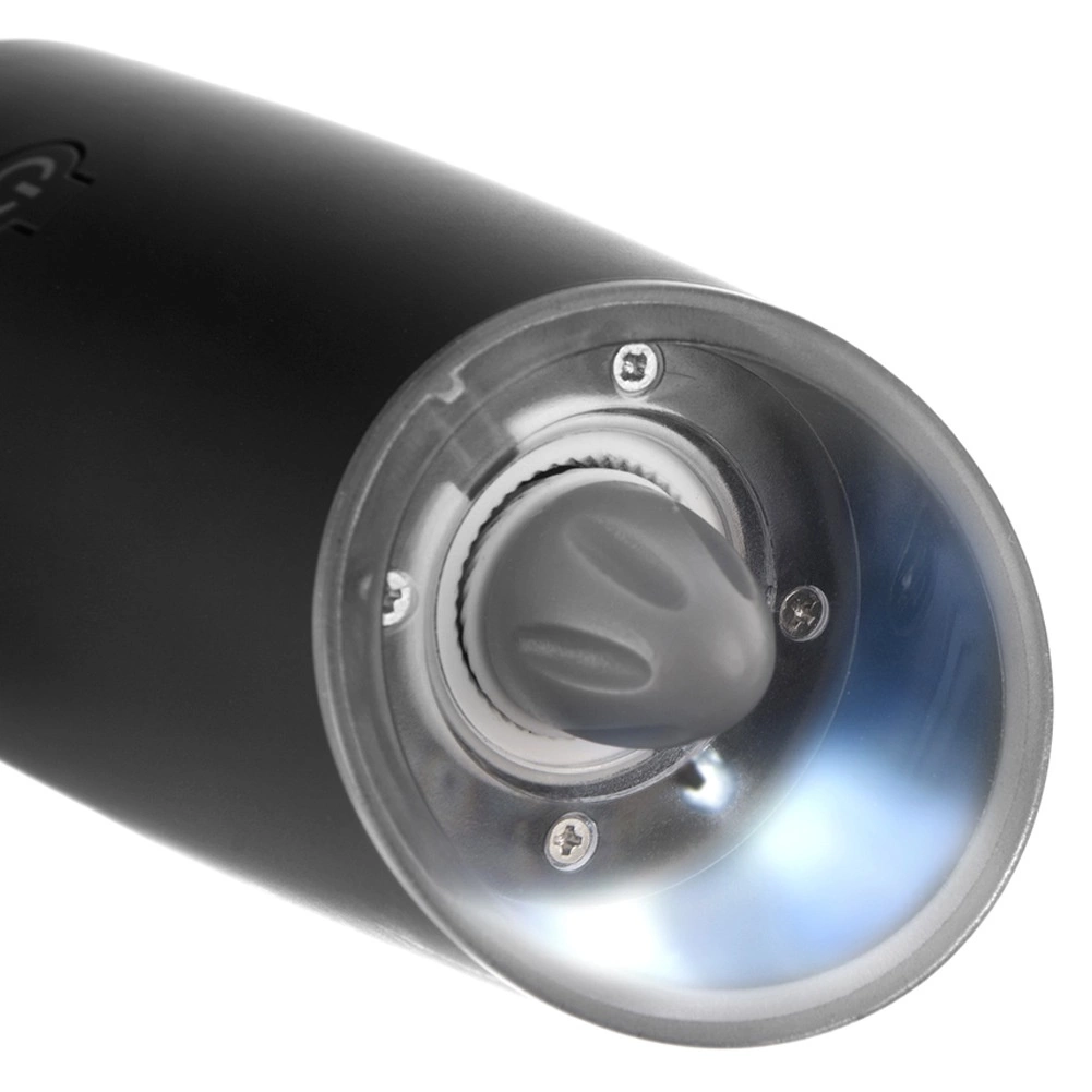 Integrētā LED gaisma un automātiska iedarbināšana, pagriežot, atvieglo precīzu piegaršošanu tieši uz šķīvja vai pannas ar vienu roku.