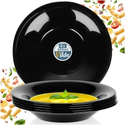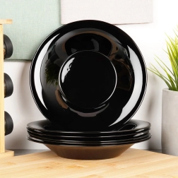Elegants 6 dziļo šķīvju komplekts no opālstikla melnā krāsā ir ideāli piemērots ikdienas lietošanai un svinīgiem brīžiem. Katram šķīvim ir 21,5 cm diametrs un 400 ml tilpums – lieliski der zupām, pastai un salātiem. Materiāls ir izturīgs pret temperatūru līdz +100 °C, to var mazgāt trauku mazgājamajā mašīnā un lietot mikroviļņu krāsnī. Stilīgs izskats, daudzpusīgs pielietojums un vienkārša kopšana jūsu modernajai virtuvei.