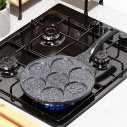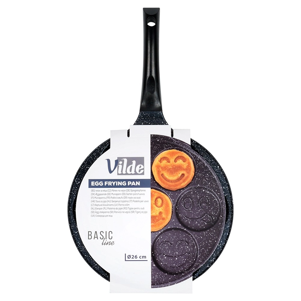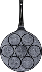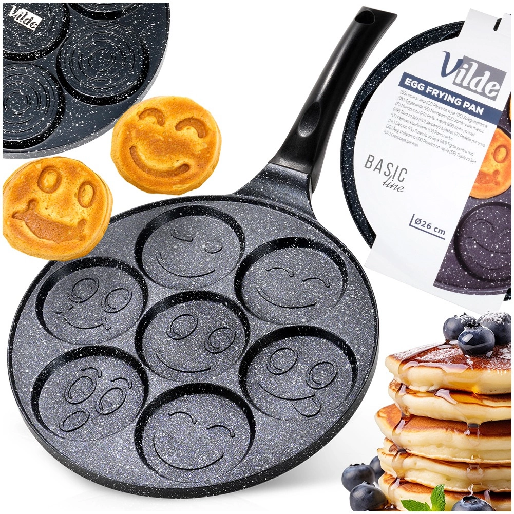 Jautri mini plācenīši un perfekti apaļas olas viegli un ātri – šī 26 cm BASIC LINE granīta panna piedāvā 7 atsevišķas formiņas (apm. 8 cm) ar smaidiņu reljefiem. Pateicoties nepiedegošajai granīta virsmai, varat gatavot ar minimumu tauku, tā uzsilst vienmērīgi un tai ir ērts rokturis ar cilpu pakarināšanai. Piemērota gāzes, elektriskajām un keramikas plītīm un der trauku mazgājamajā mašīnā.