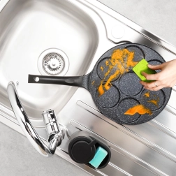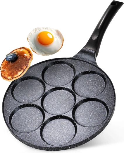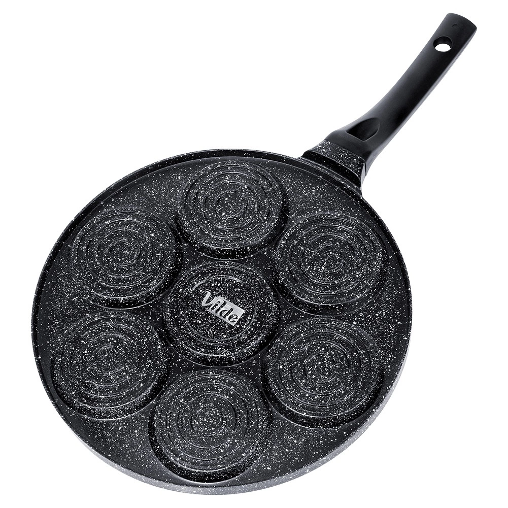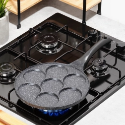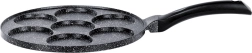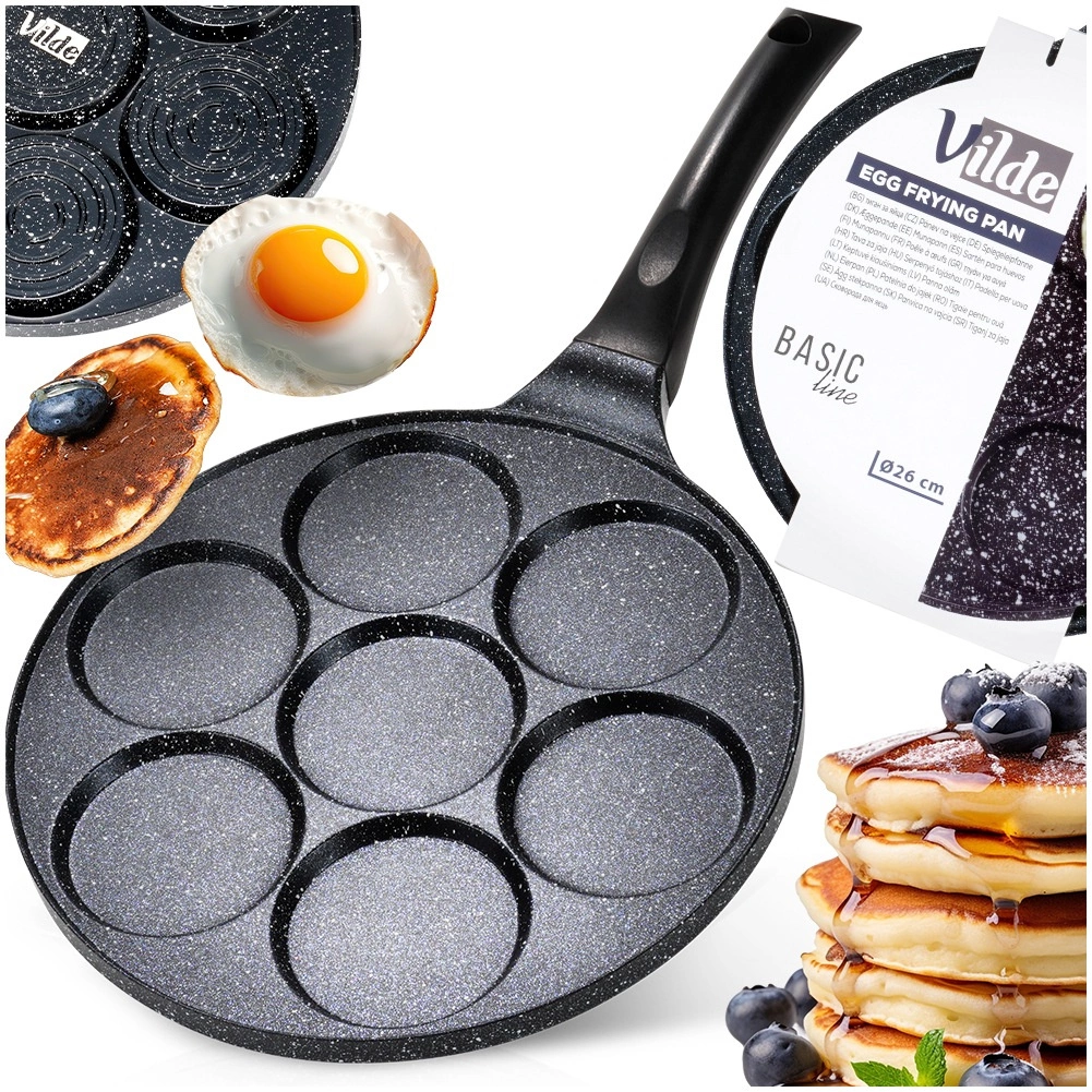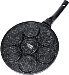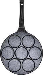 Praktiska granīta panna ar 7 apaļām atverēm (Ø 8 cm) nevainojami veidotiem olām, plācenīšiem un mini pankūkām. Viegls alumīnija korpuss ar nepielīpošu pārklājumu gatavošanai ar minimumu tauku, vienmērīga siltuma sadale un ergonomisks rokturis ar aili piekāršanai. Piemērota gāzes, elektriskajām un keramikas plītīm un trauku mazgājamajai mašīnai.