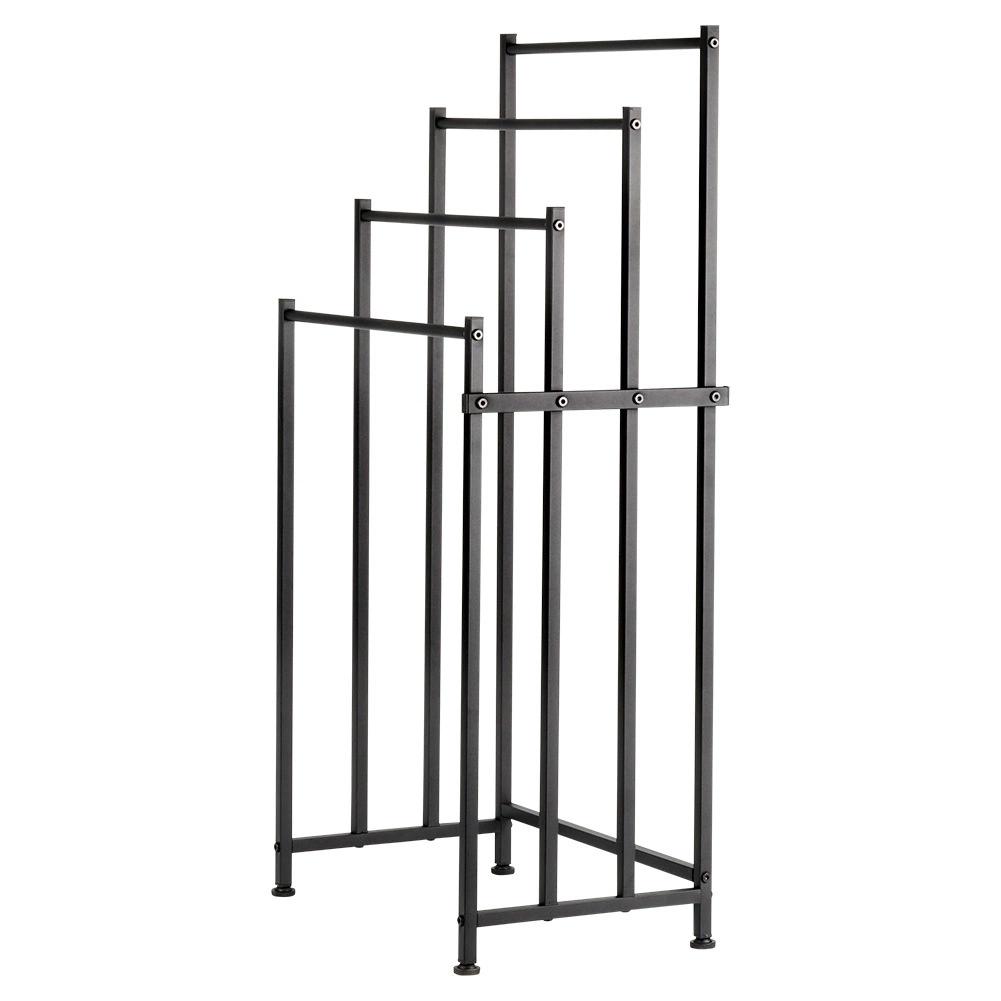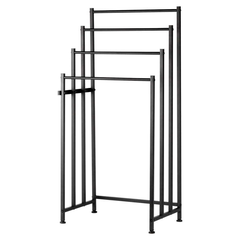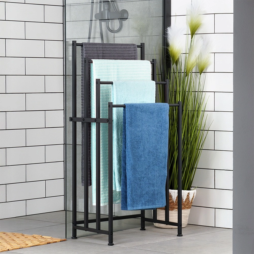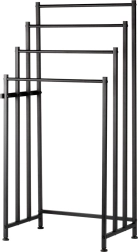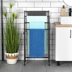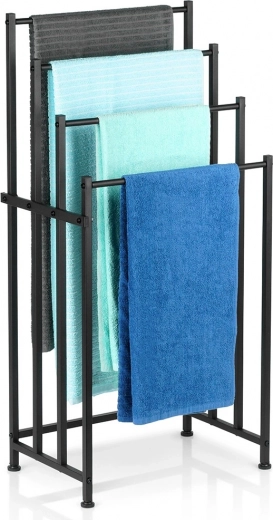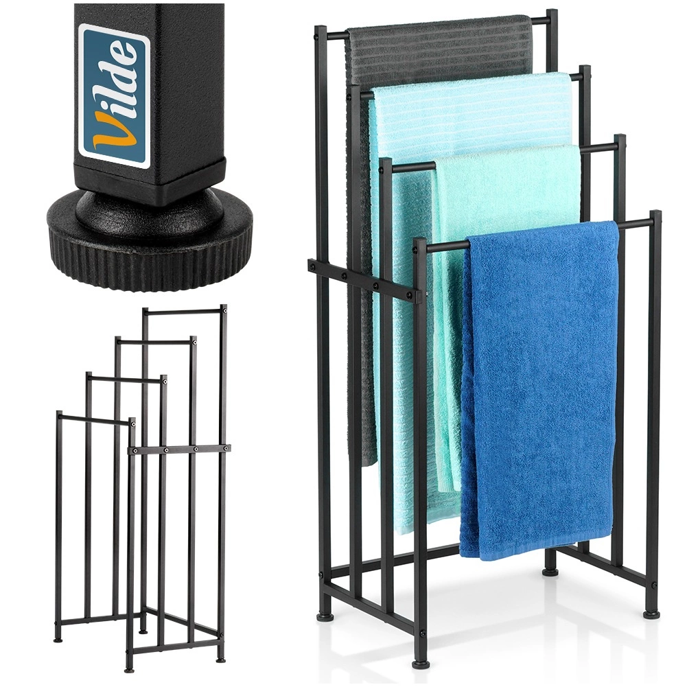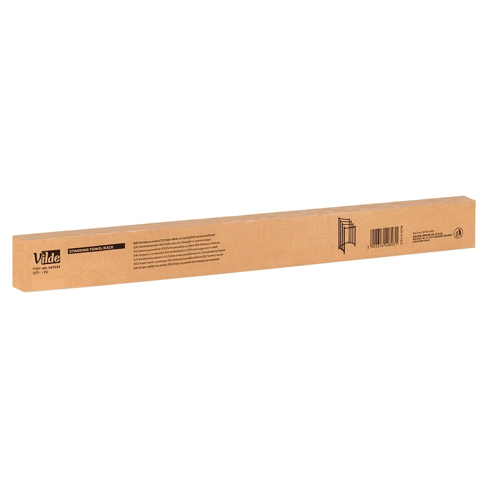 Brīvi stāvošais metāla dvieļu statīvs Vilde ir praktisks risinājums jebkurai vannasistabai. Četras izturīgas šķērstīpas ļauj izkārt vairākus dvieļus vienlaikus vairākos līmeņos ātrākai izžūšanai un labākai gaisa cirkulācijai. Pulverkrāsots metāls elegantā melnā tonī piešķir interjeram modernu lofta raksturu.