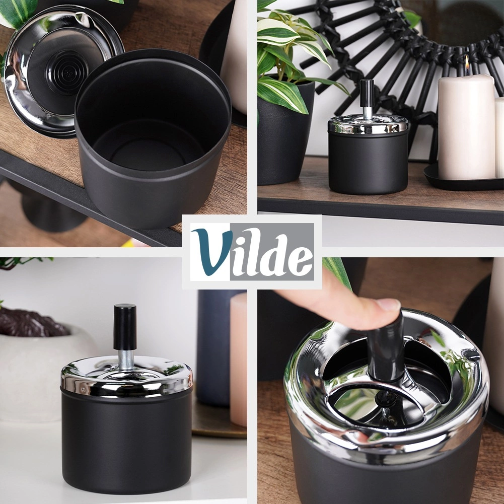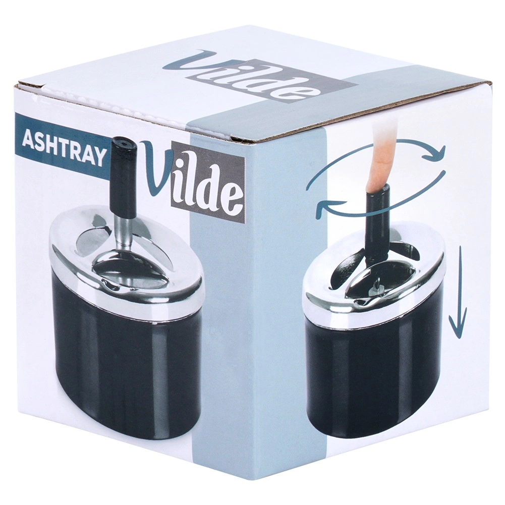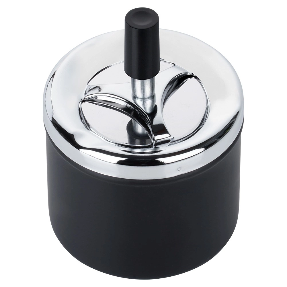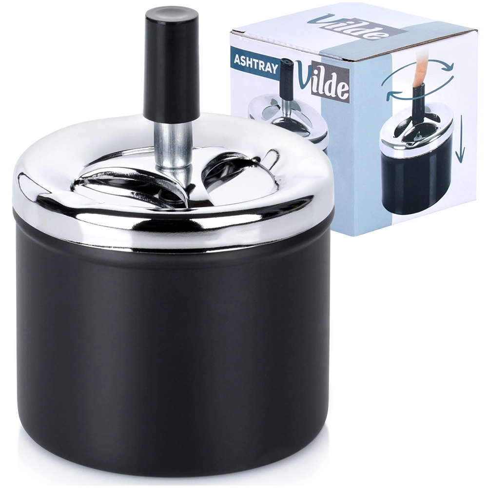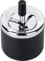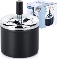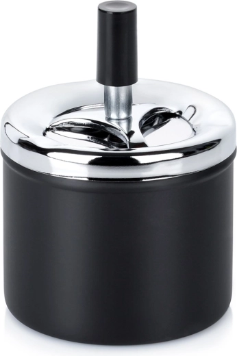 Stilīga metāla pelnutrauka ar griežamu vāciņu un pogu ērtai aizvēršanai uztur apkārtni bez netīrumiem un smakām. Matēta melna krāsa, izturīgs izpildījums un praktisks mehānisms nodrošina tīrību un ērtumu gan mājās, gan ēdināšanas vietās.