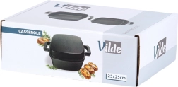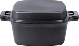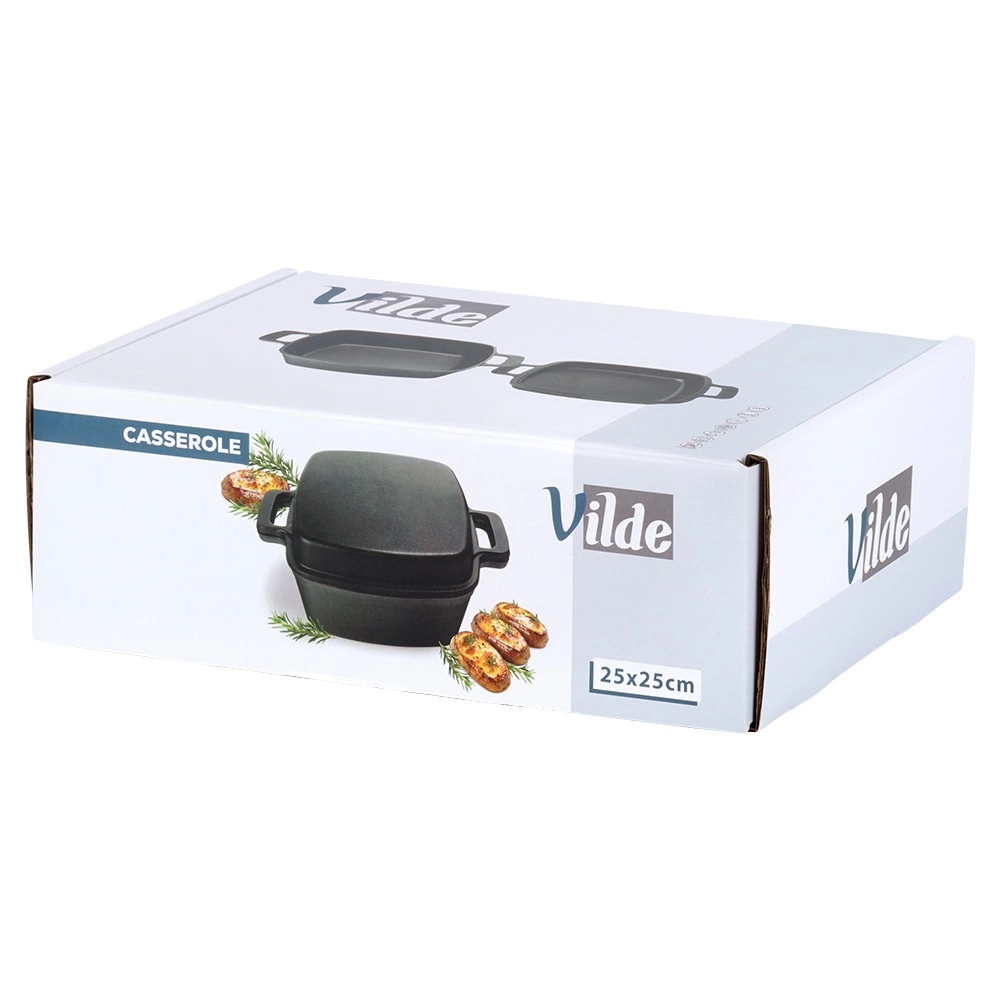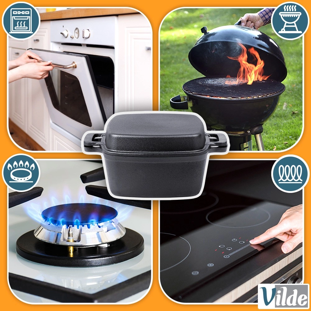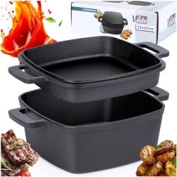 Universāls kvadrātveida čuguna katls 2in1 ar vāku, kas kalpo arī kā atsevišķa panna/cepamtrauks. Masīvais čuguns lieliski vada un uzkrāj siltumu, ir izturīgs pret augstām temperatūrām un piemērots visiem plīšu tipiem, tostarp indukcijai, krāsnij, grilam un atklātai ugunij. Ideāli piemērots dusināšanai, cepšanai, zupu, gulašu un sacepumu gatavošanai. Oriģināls VILDE produkts no CAST LINE līnijas.
