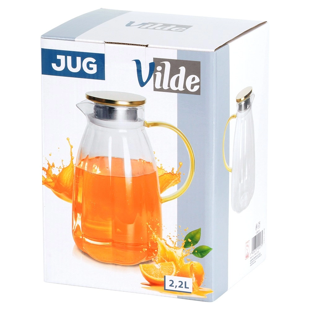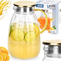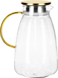 Stilīga un praktiska stikla krūka, kas izcelsies uz jebkura galda. Caurspīdīgais, kvalitatīvais biezais stikls skaisti izceļ citronus, garšaugus vai ledus kubiņus, bet zelta krāsas nerūsējoša tērauda vāciņš aizsargā dzērienu no netīrumiem un kukaiņiem. Ergonomiskais dzeltenais rokturis un veidotais kakliņš nodrošina drošu un precīzu liešanu bez pilieniem.