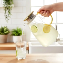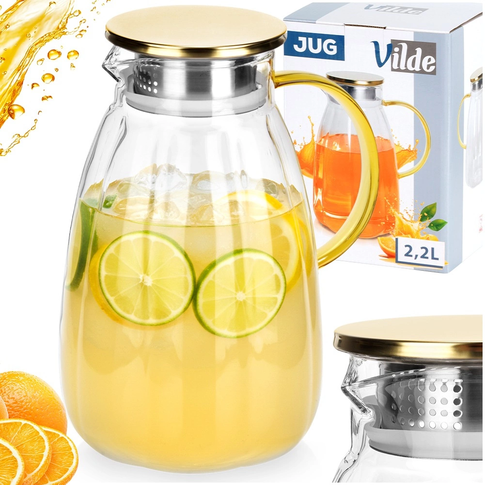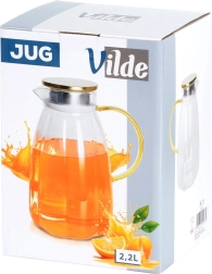 Elegantā stikla krūka ar tilpumu 2,2 l, nerūsējoša tērauda vāciņu zelta tonī un ergonomisku dzeltenu rokturi. Pateicoties veidotajam uzpiles knābītim, tā ļauj liet tīri un ērti. Ideāli piemērota ūdenim, limonādei, sulām un ledus tējai, bet slaidās formas dēļ tā ietilpst ledusskapja durvīs. Var mazgāt trauku mazgājamā mašīnā.