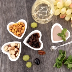 - Uzkodas, rieksti, žāvēti augļi, dipi, mērces, mini deserti