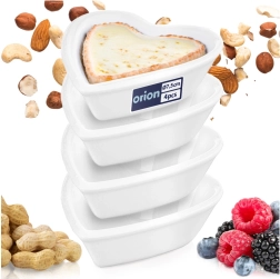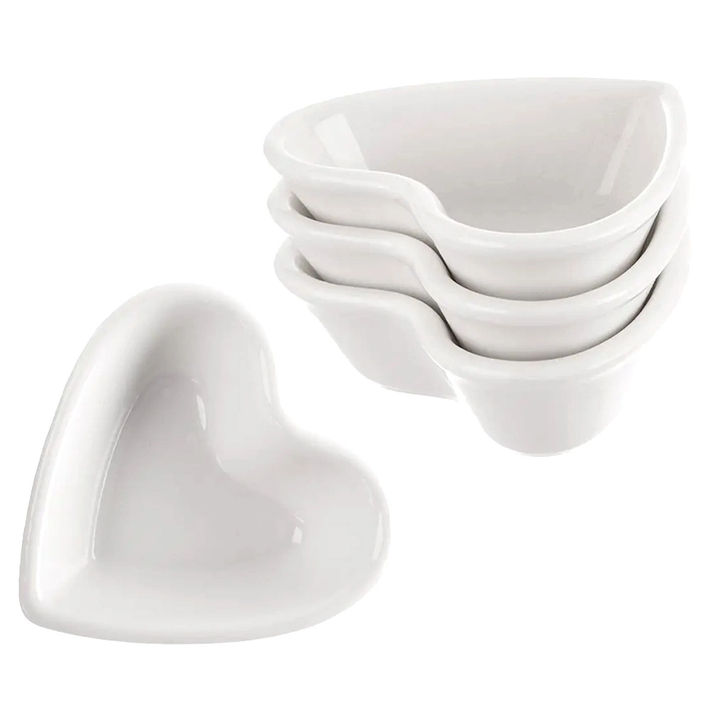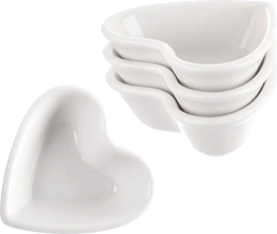 Eleganta četru baltu sirds formas porcelāna bļodiņu komplekts ar tilpumu 35 ml un izmēriem 7,5 × 7,5 × 2,5 cm. Ideāli piemērotas uzkodām, dipiem un mērcēm un arī mini desertiem. Iztur līdz temperatūrai 200 °C, piemērotas cepeškrāsnij, mikroviļņu krāsnij un trauku mazgājamai mašīnai. Klasiskais baltas krāsas dizains iederēsies jebkurā mājoklī un gastronomijā.