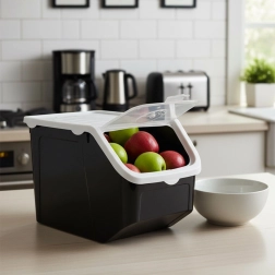 Uzturiet kārtību pieliekamajā un uz virsmām ar ietilpīgo 12 l konteineru. Caurspīdīgā atveramā klapīte ļauj ātri pārbaudīt saturu un viegli paņemt nepieciešamo daudzumu. Baltā hermētiskā vāka blīvējums pasargā no mitruma un smakām, bet regulējamā ventilācija palīdz augļiem un dārzeņiem saglabāties svaigiem ilgāk.