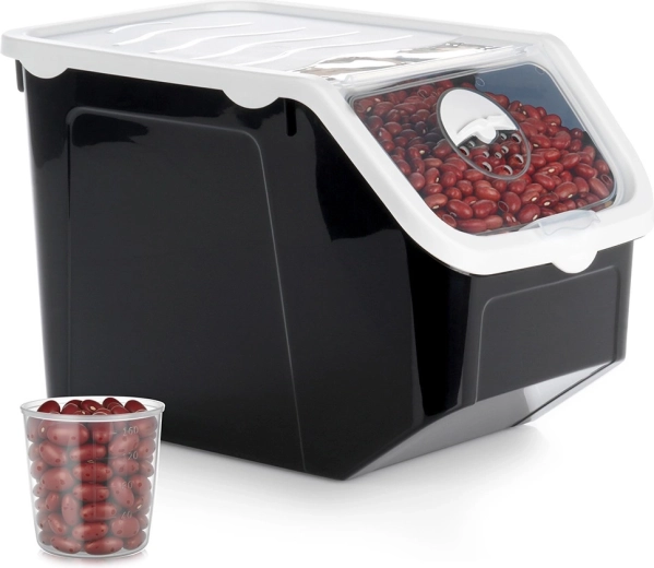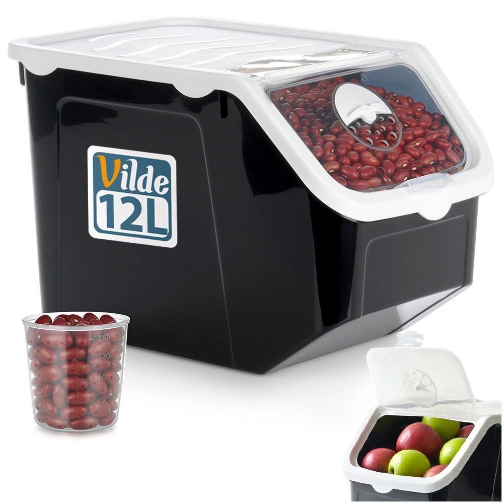 Konteiners ir ideāli piemērots kartupeļiem, sīpoliem, ķiplokiem, kā arī makaronām, pākšaugiem, mājdzīvnieku barībai vai pulverveida maisījumiem. Kvalitatīva plastmasa bez BPA ir droša saskarē ar pārtiku, piemērota saldētavai un trauku mazgājamajai mašīnai. Praktiskā mērkupa ar 40–160 ml iedaļām atvieglo precīzu dozēšanu.