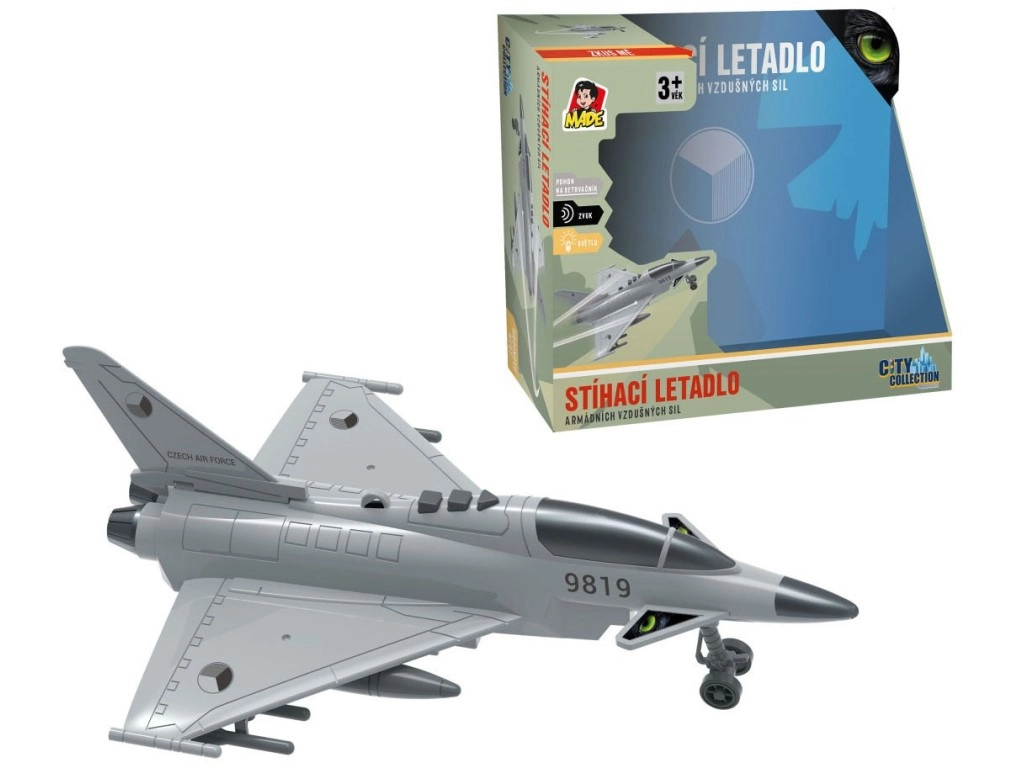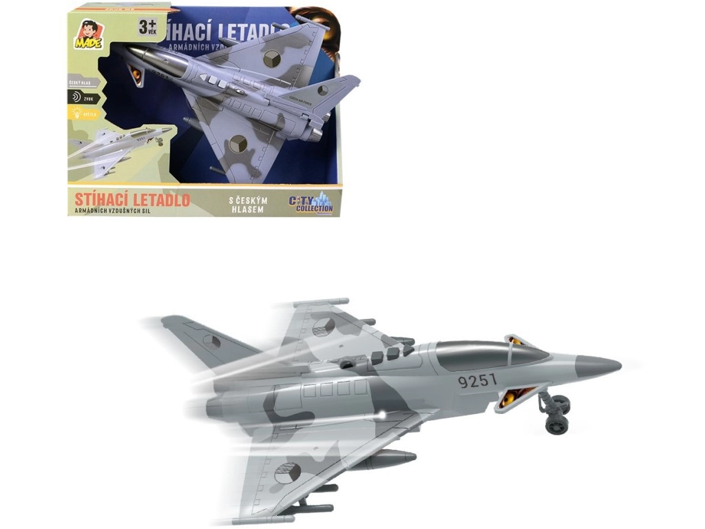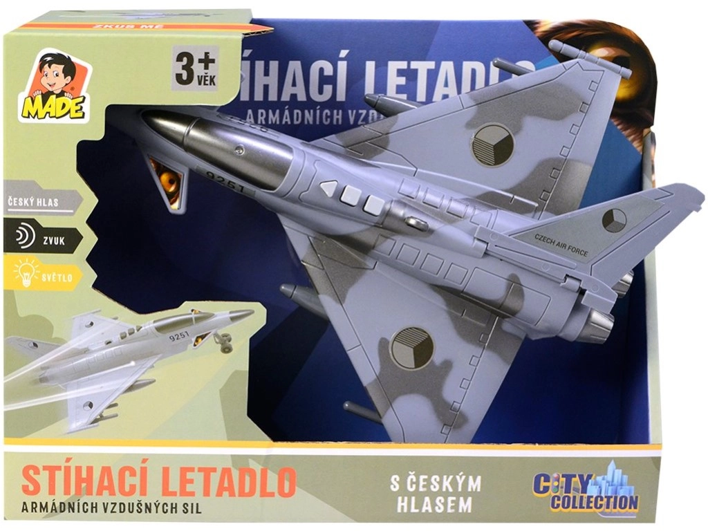 Kļūsti par debesu varoni! Šis iznīcinātājs ar Čehijas atpazīšanas zīmēm piedāvā reālistiskus gaismas un skaņas efektus, inerciālo piedziņu un čehu valodas balss frāzes no torņa un kabīnes. Ideāla dāvana mazajiem pilotiem no 3 gadu vecuma.