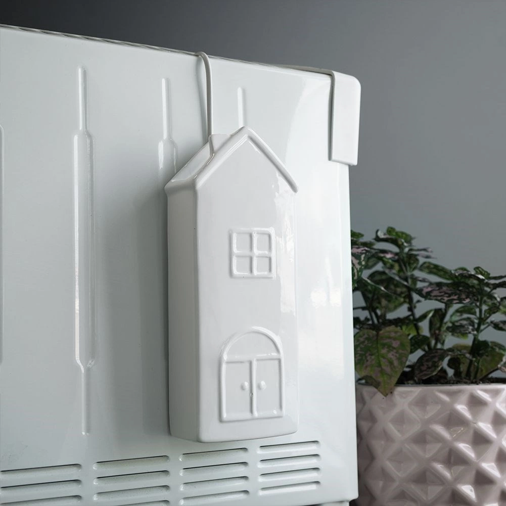 Elegantais keramikas gaisa mitrinātājs radiatoram mājiņas formā ar tilpumu 300 ml palīdz uzturēt optimālu mitrumu apkures sezonā. Pateicoties vienkāršai pakarināšanai uz metāla āķa un ērtai lietošanai, pietiek tikai piepildīt ar ūdeni. Baltā glazūra un dekoratīvais dizains iederas jebkurā interjerā. Kvalitatīva keramika nodrošina ilgu kalpošanas laiku un drošu lietošanu.
