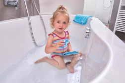 Komplektā ir jautrs pīkstošs piekariņš, kas motivē spiest, stiprina sīko motoriku un sniedz prieku, atklājot skaņas. Grāmatiņa peld uz virsmas, un bērni to var aplūkot tieši vannošanās laikā.