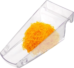 Caurspīdīgais noņemamais trauciņš savāc visu sarīvēto un ļauj ērti pārkaisīt bez nekārtības uz virsmas.