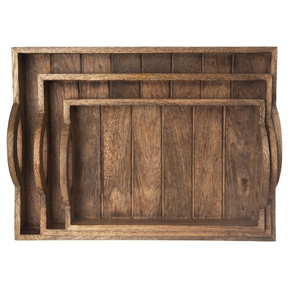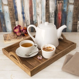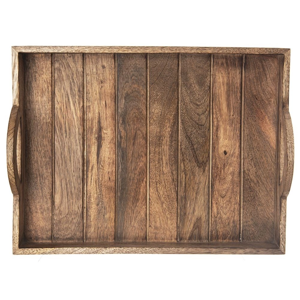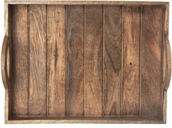 Eleganta servēšanas paplāte no eksotiskā mango koka, izmērā 40,5 × 30,5 cm, ir ideāla brokastu, desertu un dzērienu pasniegšanai. Tai ir praktiski rokturu izgriezumi, paaugstinātas malas, kas novērš noslīdēšanu, un četras pretbuksēšanas pēdiņas virsmas aizsardzībai. Izturīgais mango koks ir izturīgs pret mitrumu, ātri izžūst un neuzsūc smakas – lieliski piemērots ikdienas lietošanai mājās un gastronomijā.