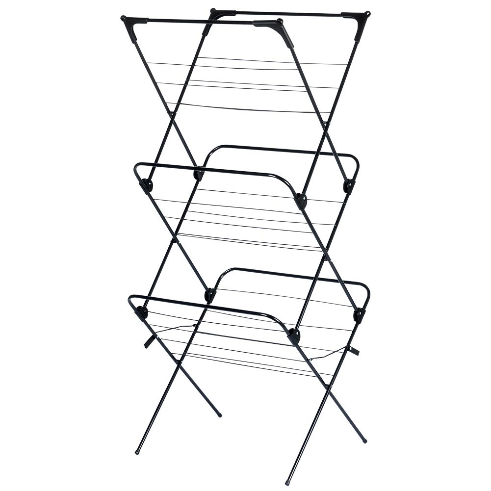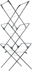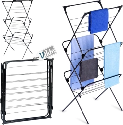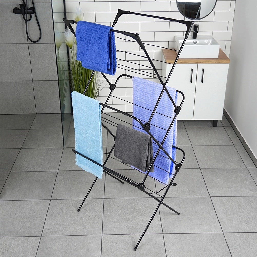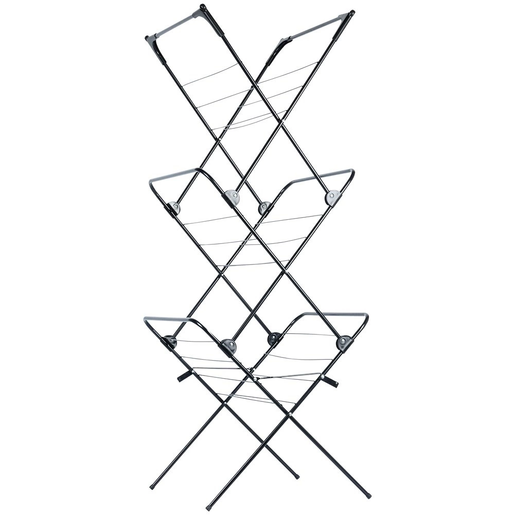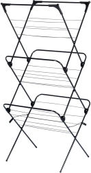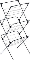 Šis vertikālais veļas žāvētājs elegantā melnā krāsā ir izgatavots no izturīga, pulverkrāsota metāla. Trīs līmeņi nodrošina pietiekami daudz vietas dvieļiem, krekliem un smalkai veļai, savukārt stabilā X konstrukcija garantē drošu lietošanu gan iekštelpās, gan ārā.