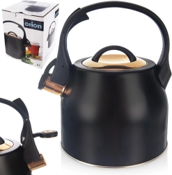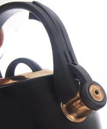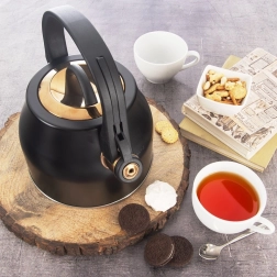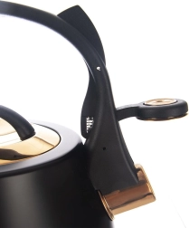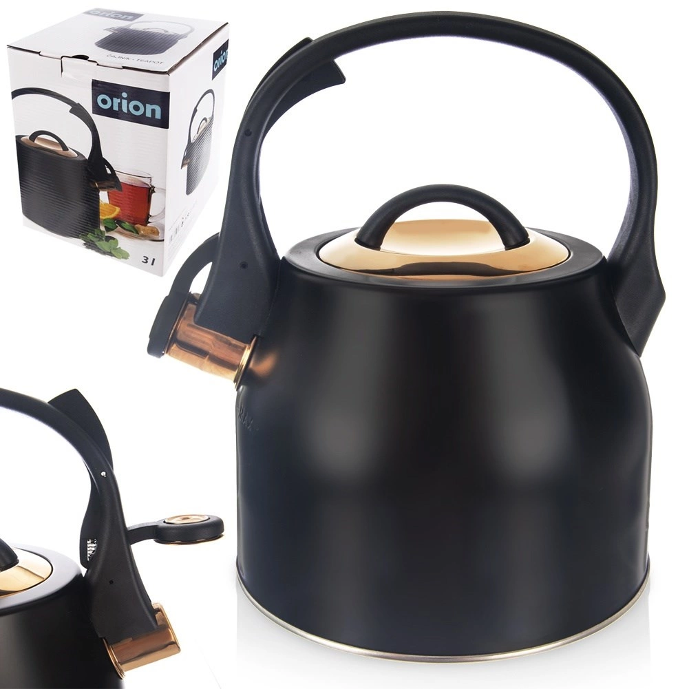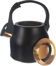 Eleganta tērauda tējkanna ar svilpi matēti melnā krāsā ar zelta akcentiem apvieno stilu un funkcionalitāti. Tai ir tilpums 3 l (lietderīgais 1,8 l), ergonomisks rokturis, atlokāma svilpe un viegli noņemams vāciņš. Piemērota visiem plīts veidiem, tostarp indukcijai, un lieliski der ikdienas ūdens vārīšanai tējai, kafijai un zāļu uzlējumiem.