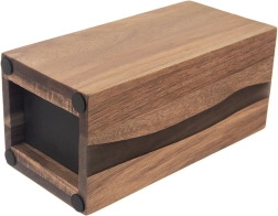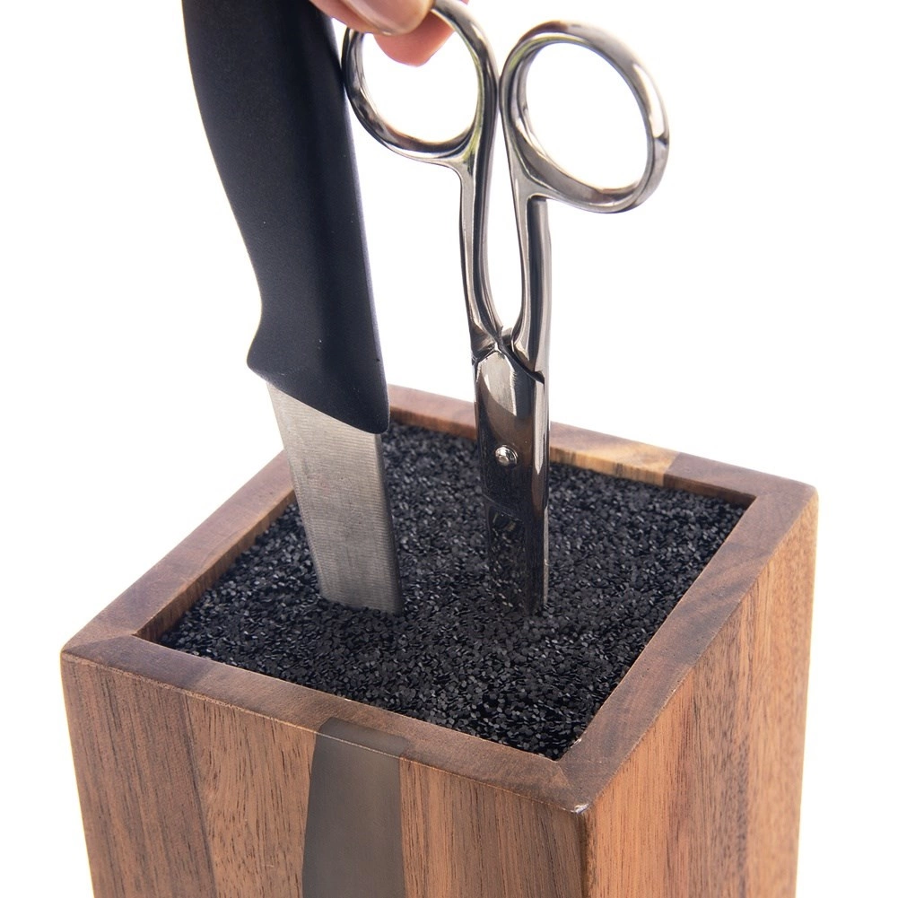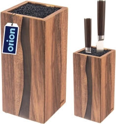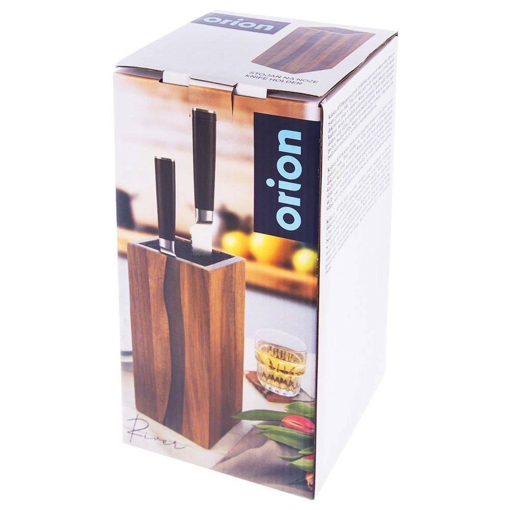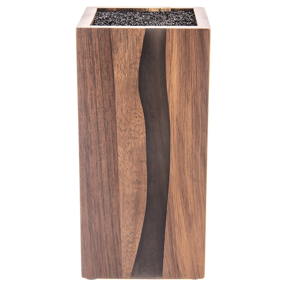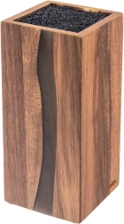 Stilīgais un funkcionālais RIVER nažu bloks ir izgatavots no kvalitatīva akācijas koka ar dekoratīviem sveķiem, kuru forma atgādina upes līniju. Pateicoties universālajai melnajai šķiedrai iekšpusē, iespējams ievietot jebkura izmēra un formas nažus, tostarp keramikas un tērauda, kā arī šķēres un mazākus virtuves piederumus. Šķiedru ieliktnis droši notur asmeņus bez fiksētām spraugām un minimizē asmeņu notrulināšanos.