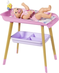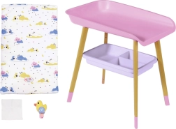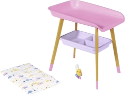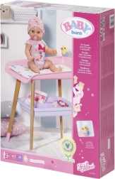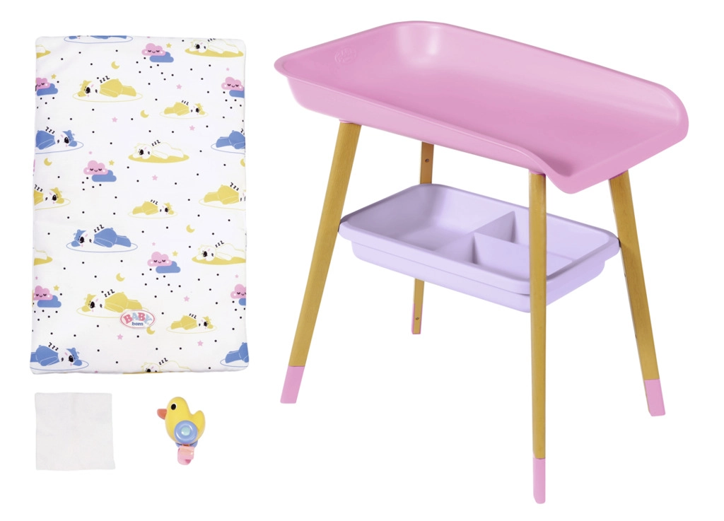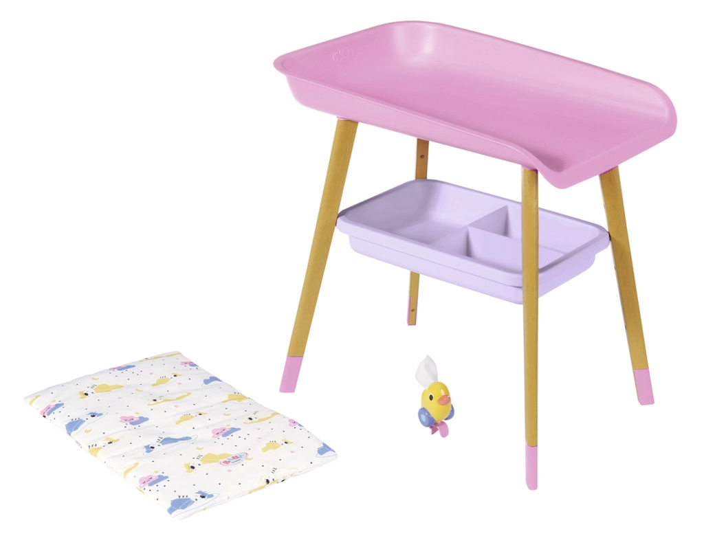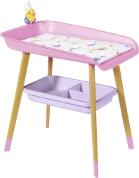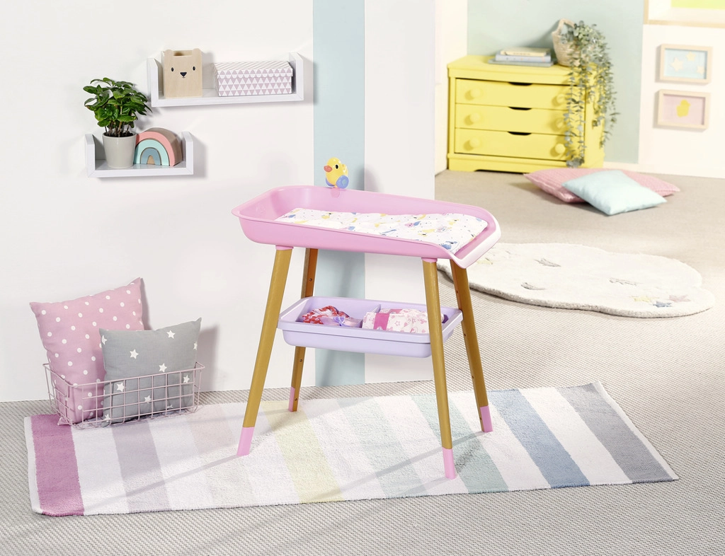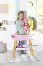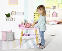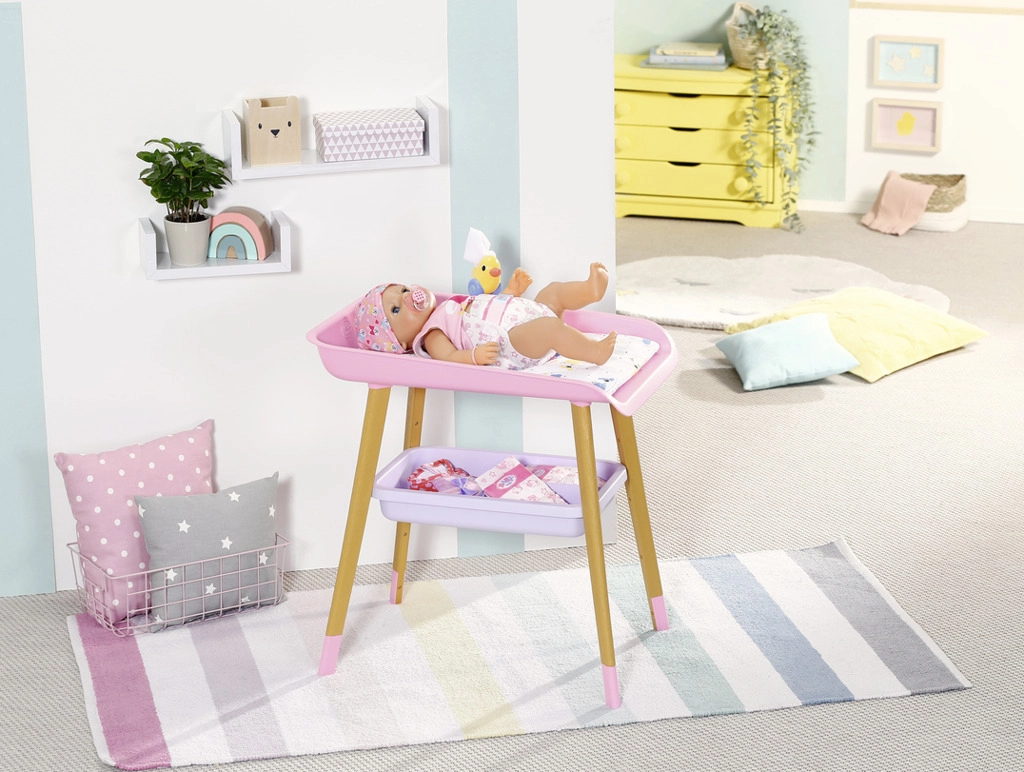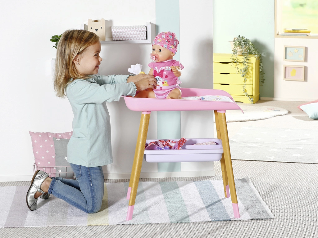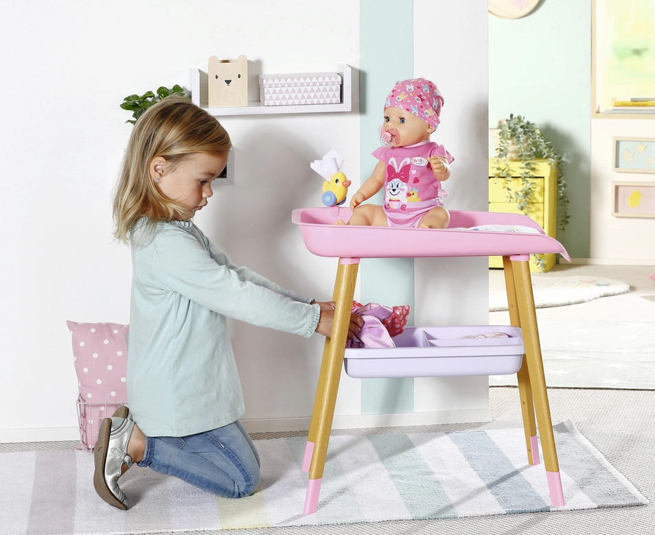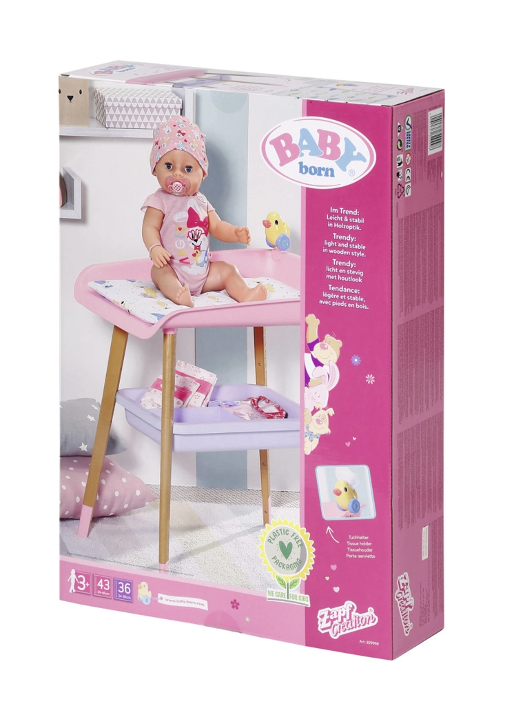 Stilīgs pārdīšanas galds lellēm BABY born sniedz bērniem reālistisku aprūpes rotaļu. Tam ir kāju koka dekors, mīksta pārdīšanas virsma, noņemams salvešu turētājs ar pīlīti un praktiskas nodalījumu vietas autiņiem, drēbēm un aksesuāriem. Lieliski papildina bērnistabu un saskaņojas ar citiem BABY born piederumiem.