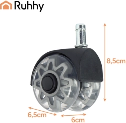 RUHHY 2,5" ritenīši ir veidoti ikdienas komfortam un ilgmūžībai. Pateicoties tērauda gultņiem un mīkstinātai PU virsmai, tie nodrošina vienmērīgu un klusu pārvietošanos pa parketu, laminātu, flīzēm un paklāju, neatstājot skrāpējumus. Uzstādīšana aizņem mirkli – izvelciet vecos ritenīšus un jaunus vienkārši iespraudiet.