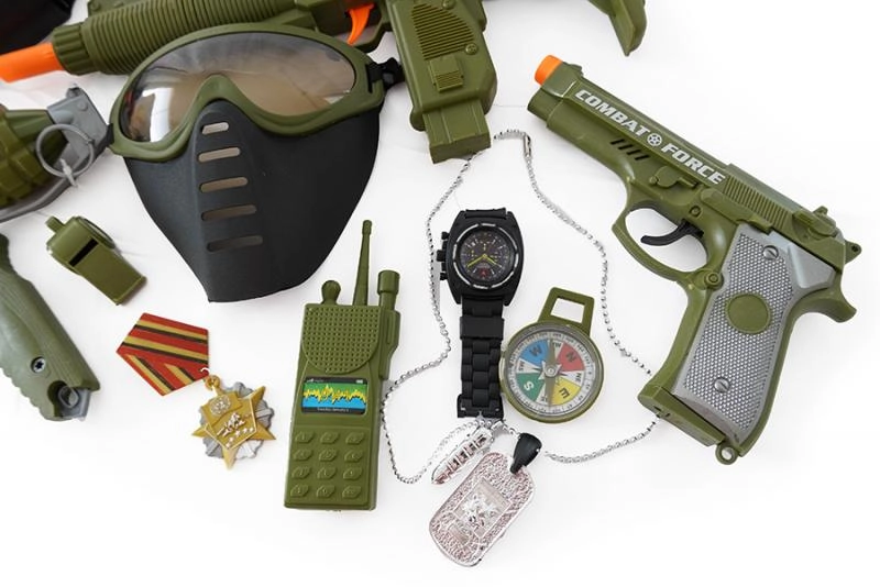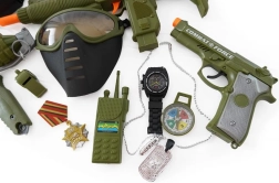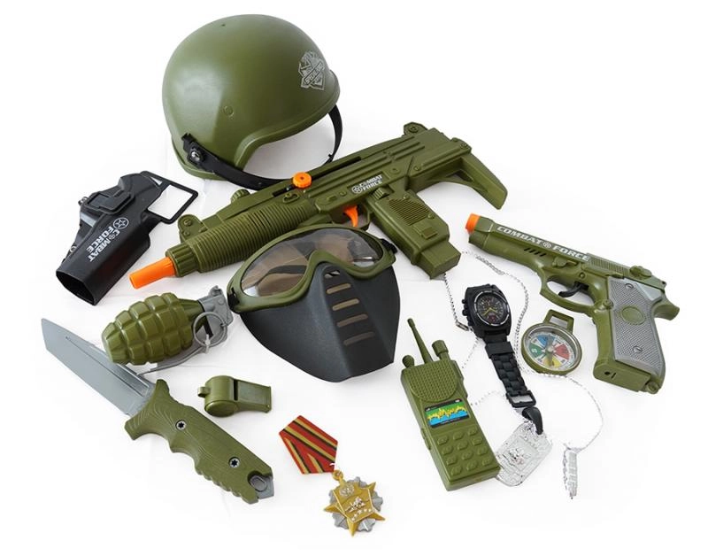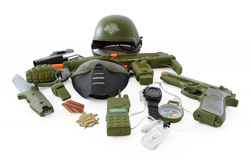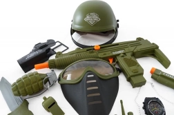 Šis bērnu militārais aprīkojums piedāvā visu nepieciešamo aizraujošām misijām: aizsargķiveri, pistoli un citus piederumus, kas pastiprina spēles pieredzi. Pateicoties reālistiskam izskatam un ērtai lietošanai, komplekts ir lieliska izvēle spēlēm telpās un ārā.