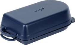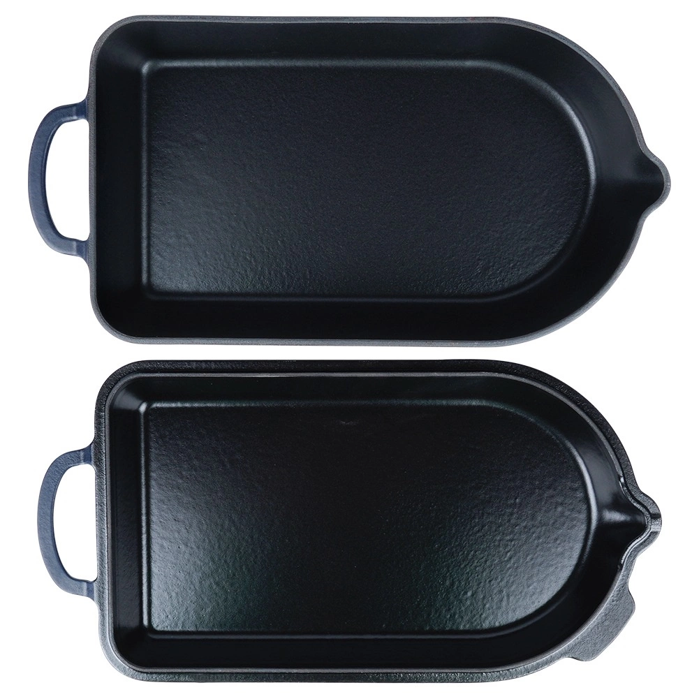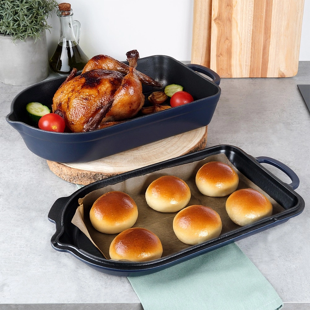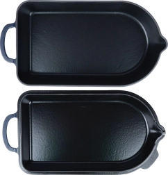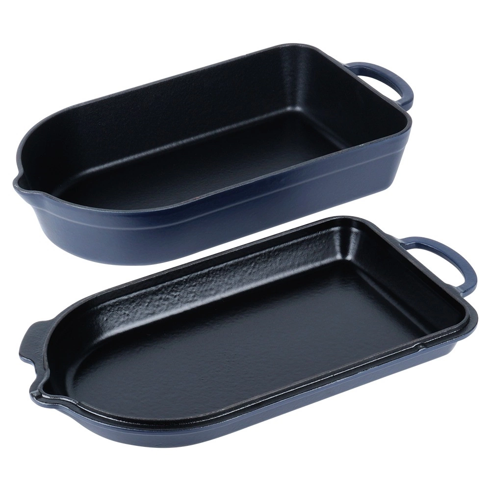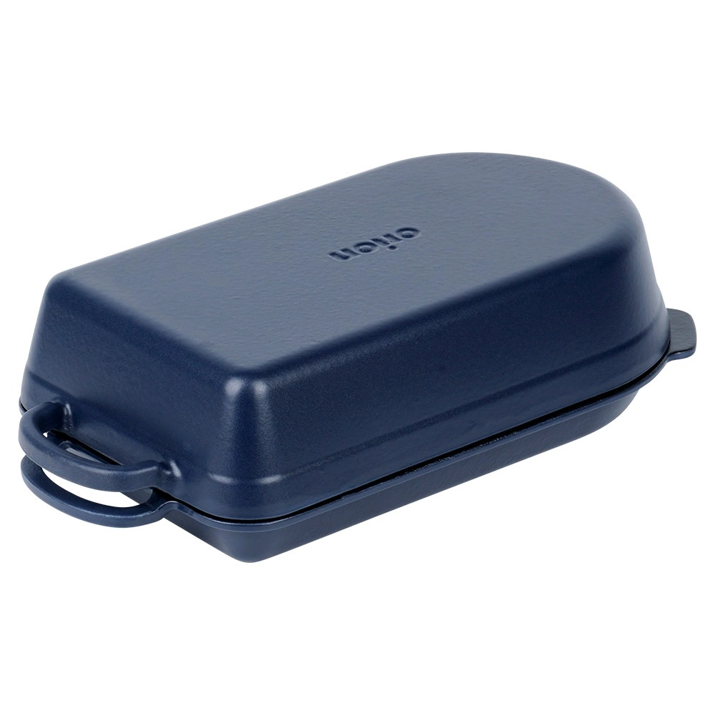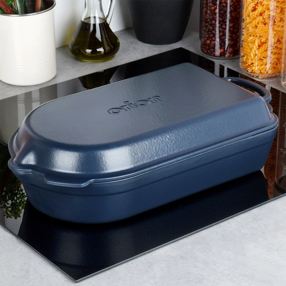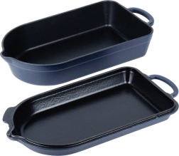 Iekšējais melnais emaljas pārklājums atvieglo cepšanu, gratinēšanu un kopšanu, ārējā tumši zilā glazūra piešķir elegantu izskatu pasniegšanai tieši uz galda. Trauks piemērots gāzes, elektriskajām, stikla keramikas, halogēna un indukcijas plītīm, kā arī krāsnij līdz 250 °C. Abām daļām ir praktiski izliešanas snīpīši ērtai sulas nolietšanai un droši rokturi ērtai pārnēsāšanai.