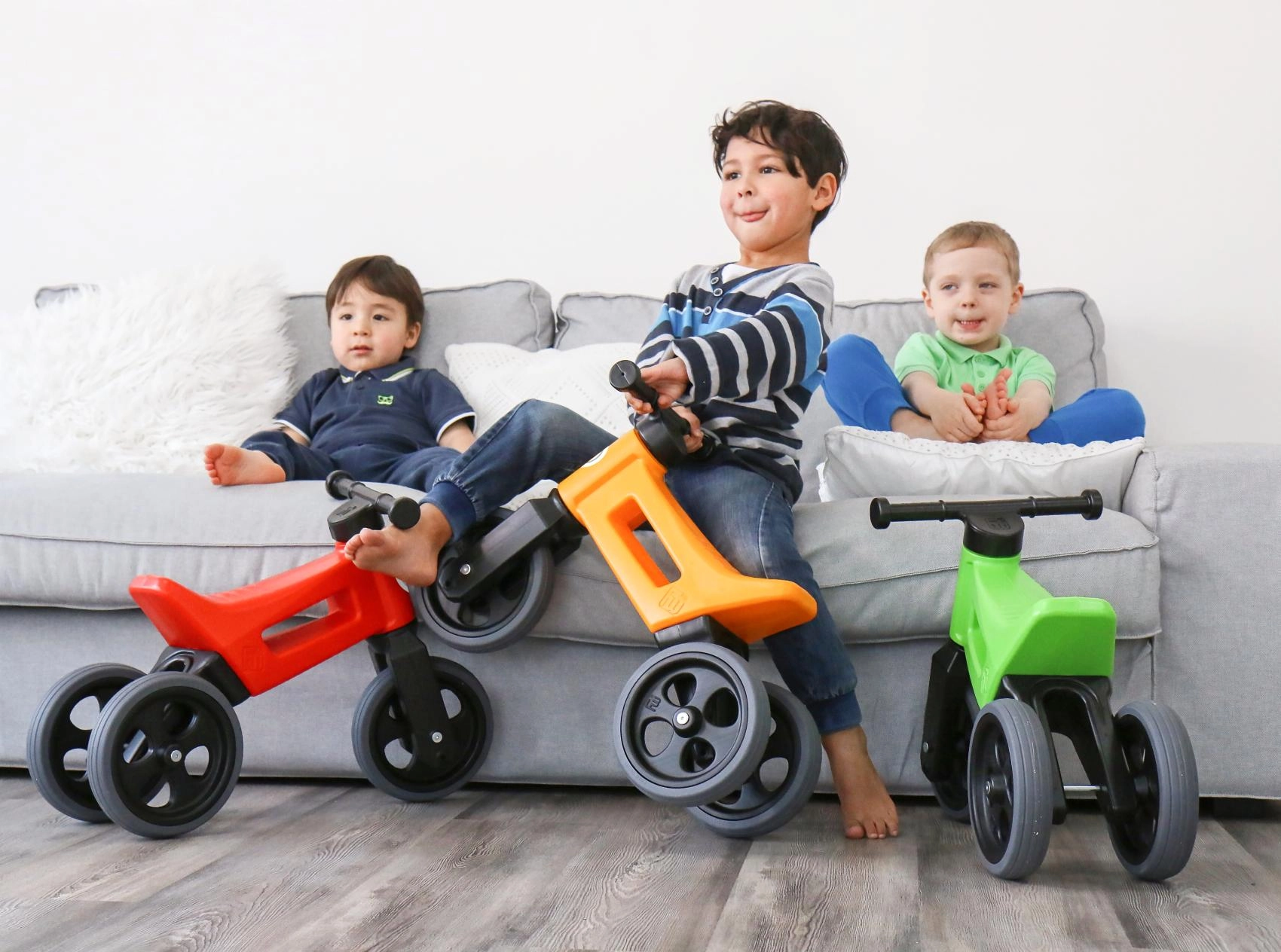 FUNNY WHEELS Rider Sport 2‑in‑1 sniedz bērniem kustību prieku un vecākiem gudru risinājumu uz ilgu laiku. Dažu minūšu laikā to var viegli pārveidot no trīsriteņa par divriteni un iestatīt divas sēdekļa augstuma pozīcijas atbilstoši bērna augumam. Klusās riepas nečīkst un neslīd, tāpēc tās ir ideāli piemērotas gan gludām virsmām, gan āra ietvēm.