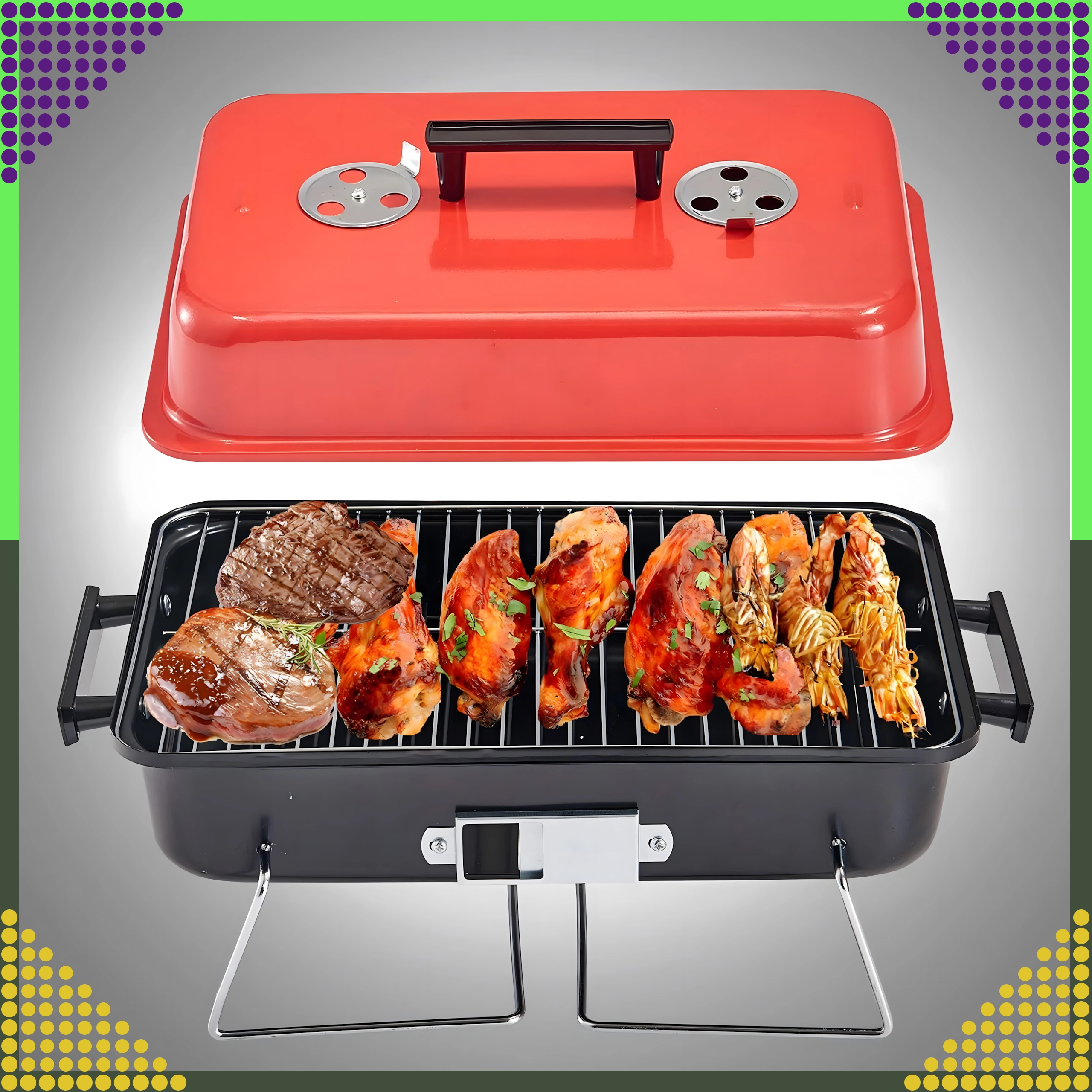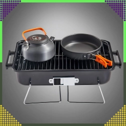 Kompakts galda grils ar kokoglēm un vāku ir ideāli piemērots kempingam, piknikam, pludmalei un dārzam. Pateicoties saliekamām kājām un vāka fiksatoram, to ir viegli pārnēsāt, tas ietilpst automašīnas bagāžniekā un nodrošina ērtu temperatūras regulēšanu ar ventilācijas atverēm. Hromēts restes režģis nodrošina vienmērīgu cepšanu, bet kompaktie izmēri 43 × 28 × 26 cm atvieglo uzglabāšanu.