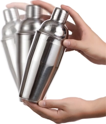 Klasisks trīsdaļīgs šeikeris ar vāciņu un integrētu sietiņu ātrai atdzesēšanai un tīrai lešanai bez ledus.