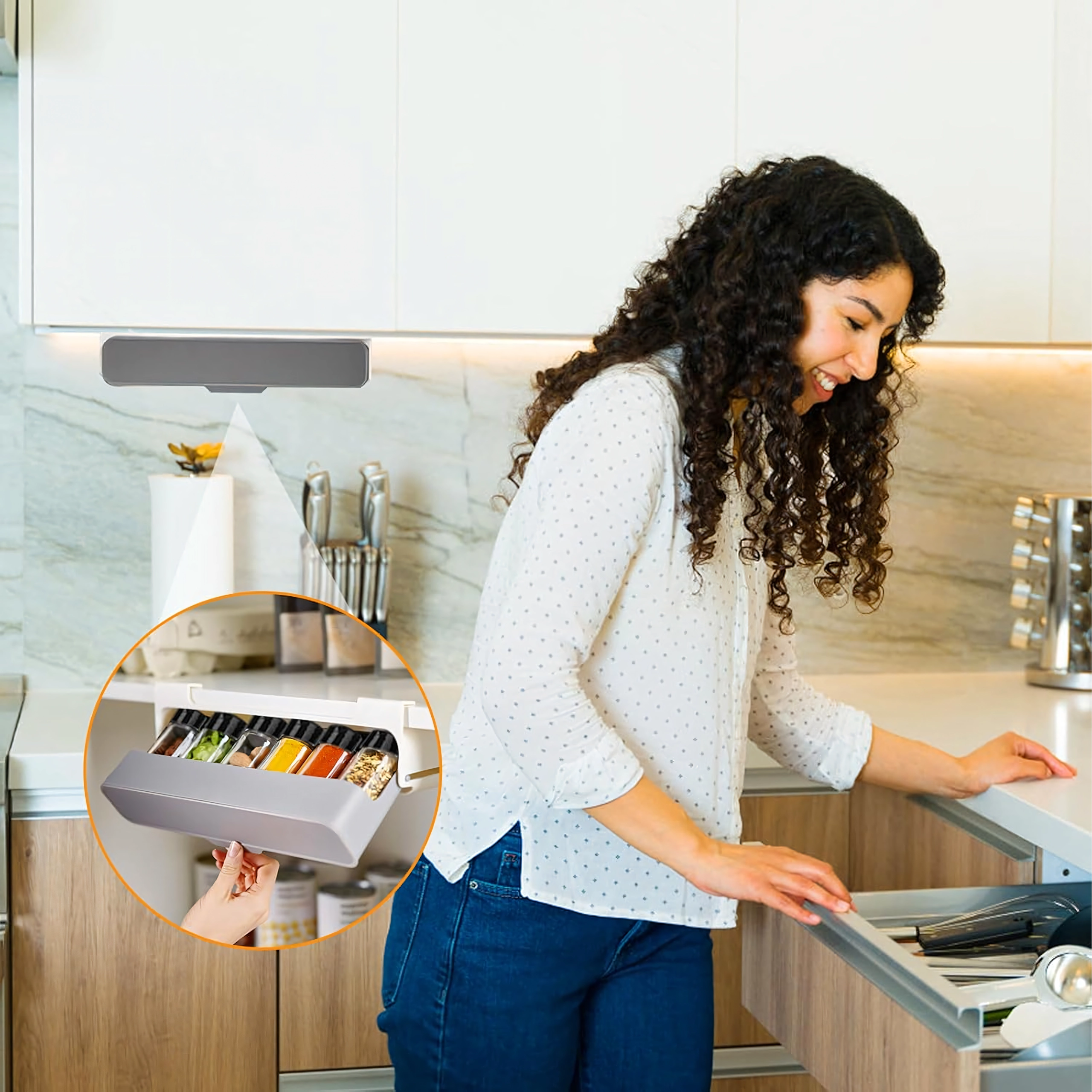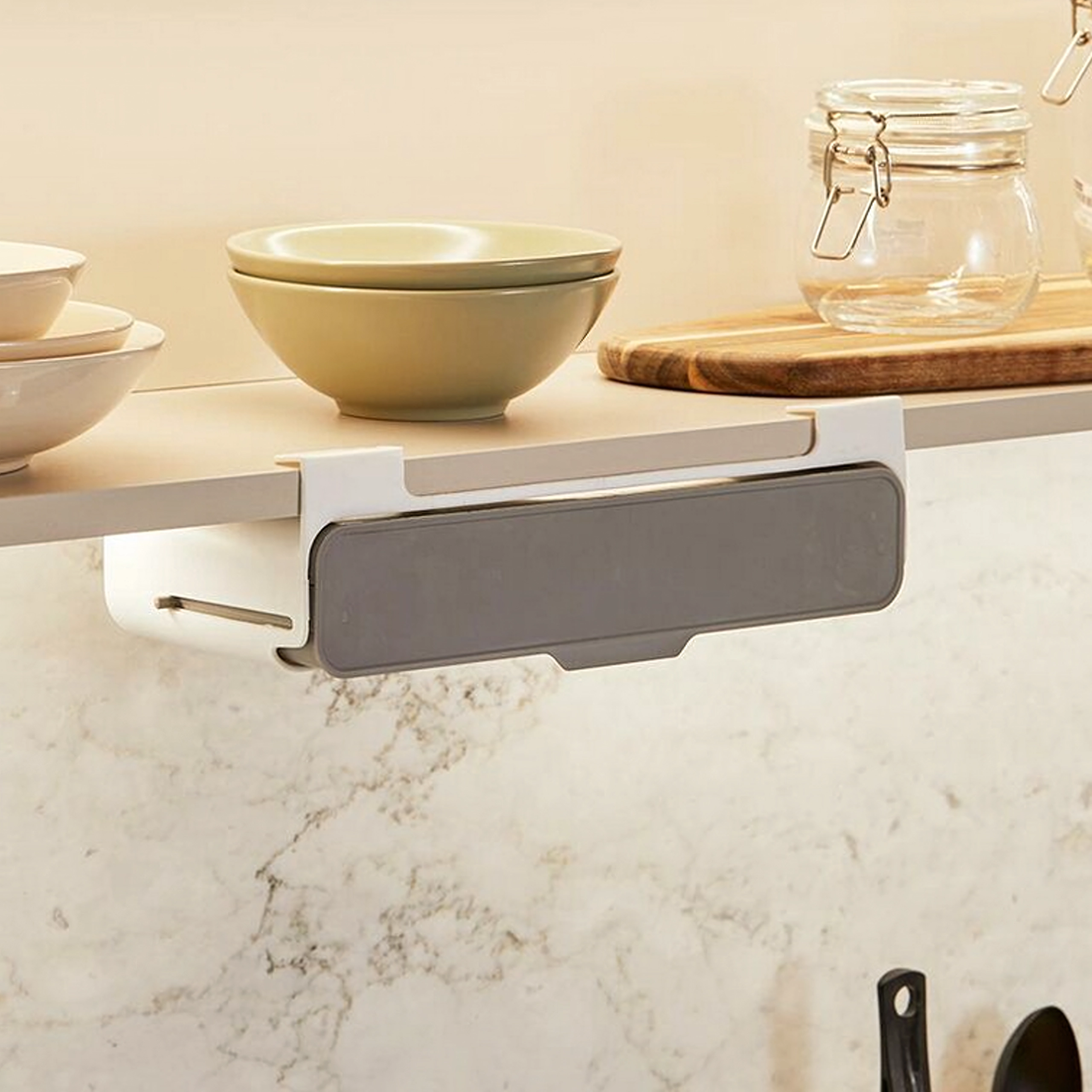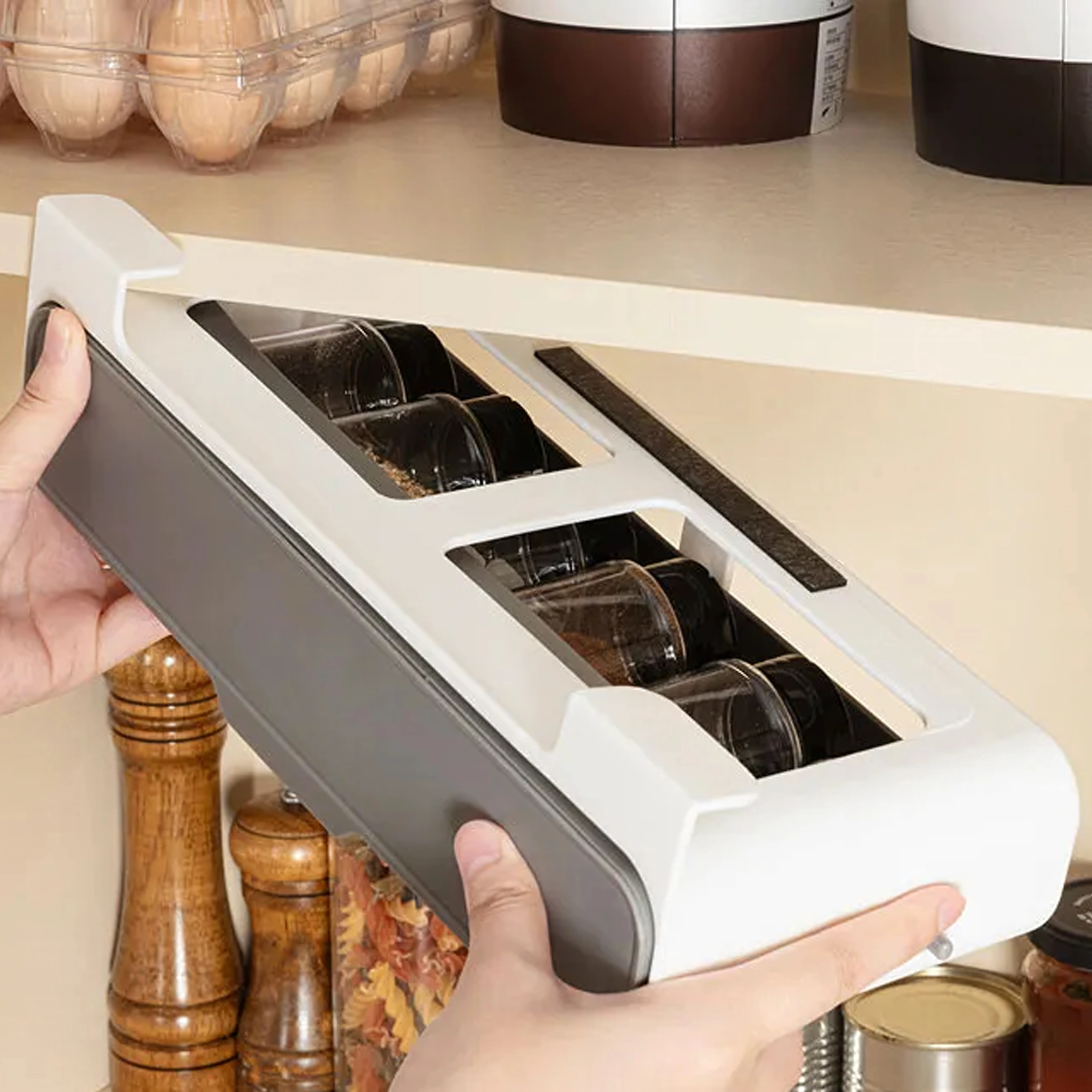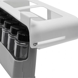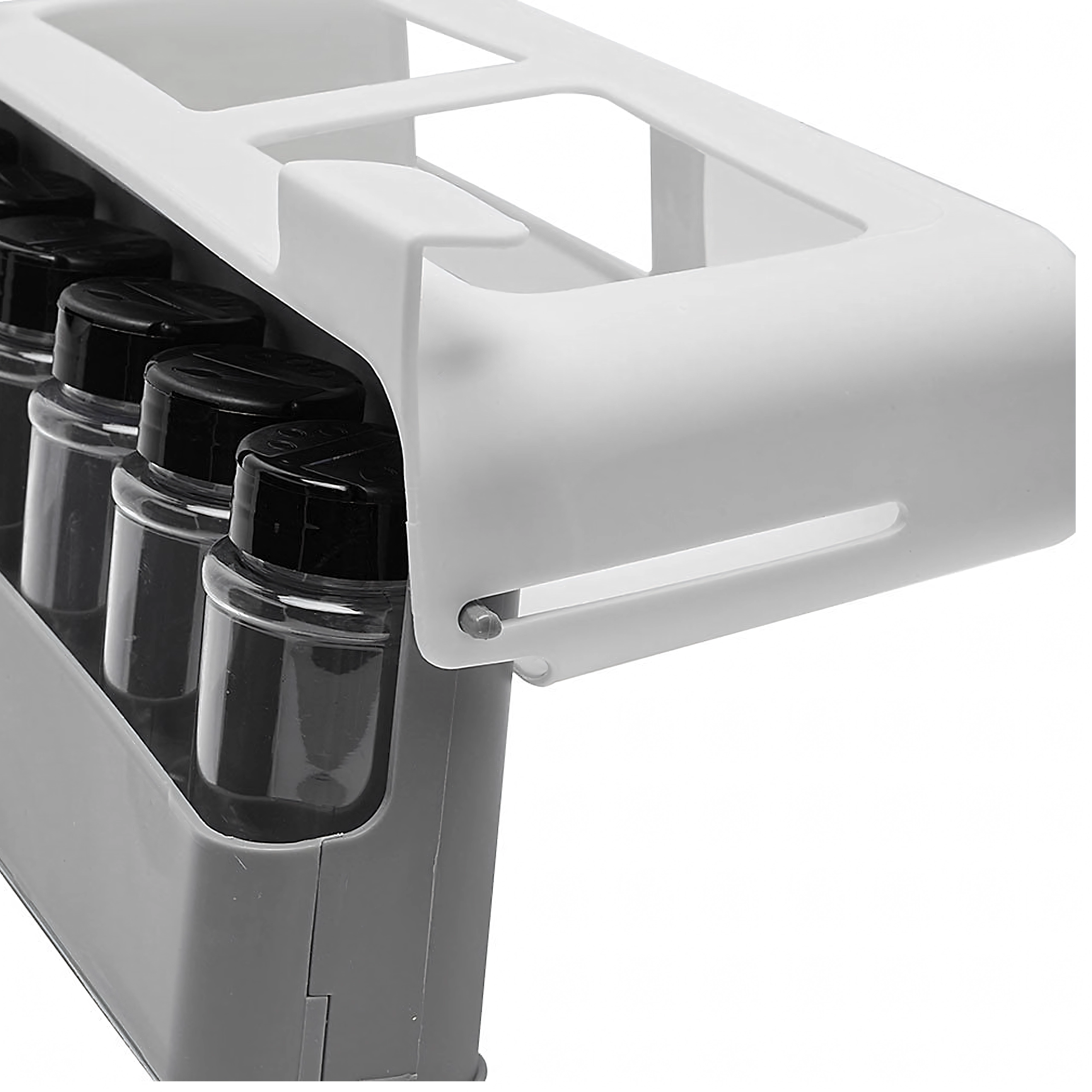 - Pārskatāmība un kārtība: iebīdāma/nolokāma sliede ērtai piekļuvei burciņām.
