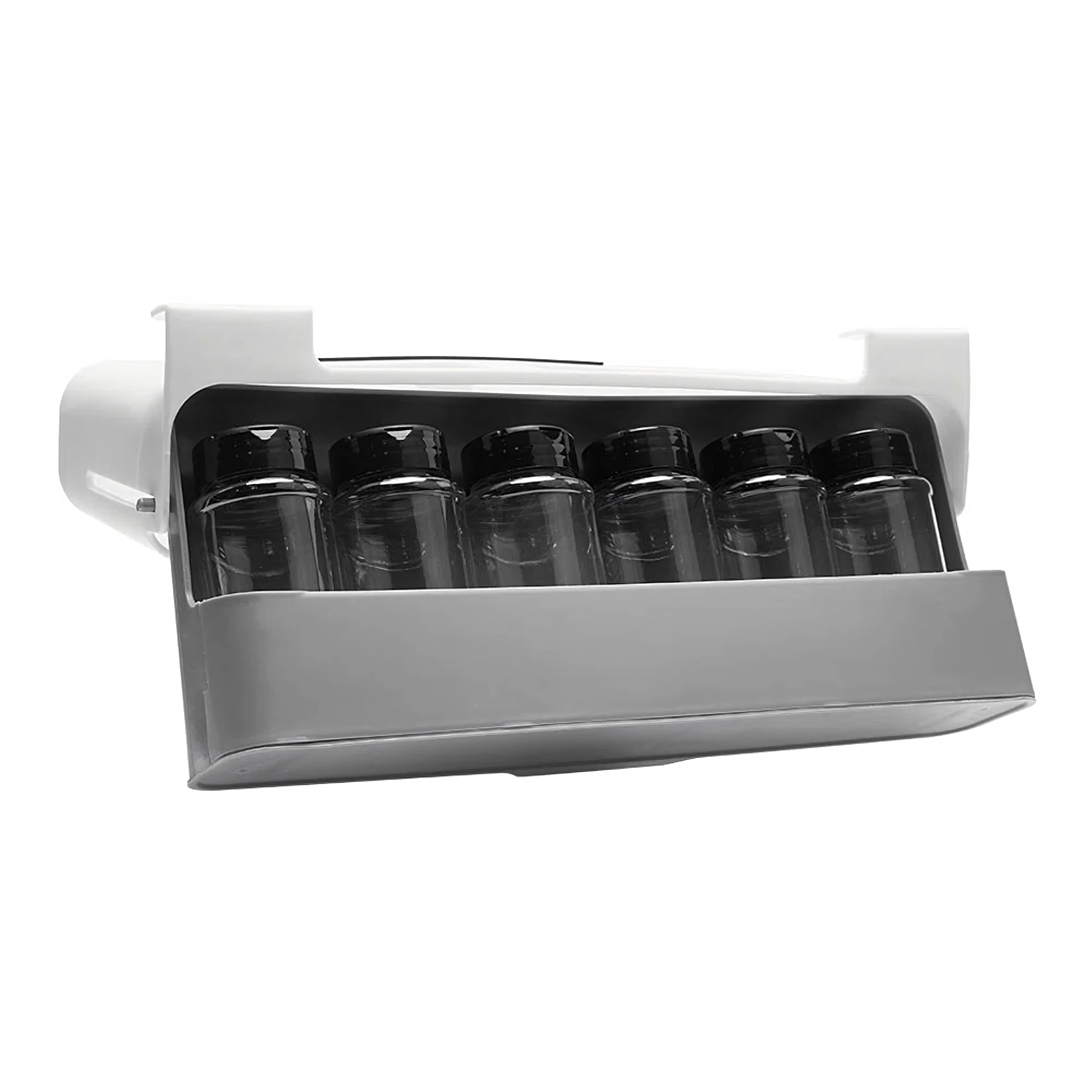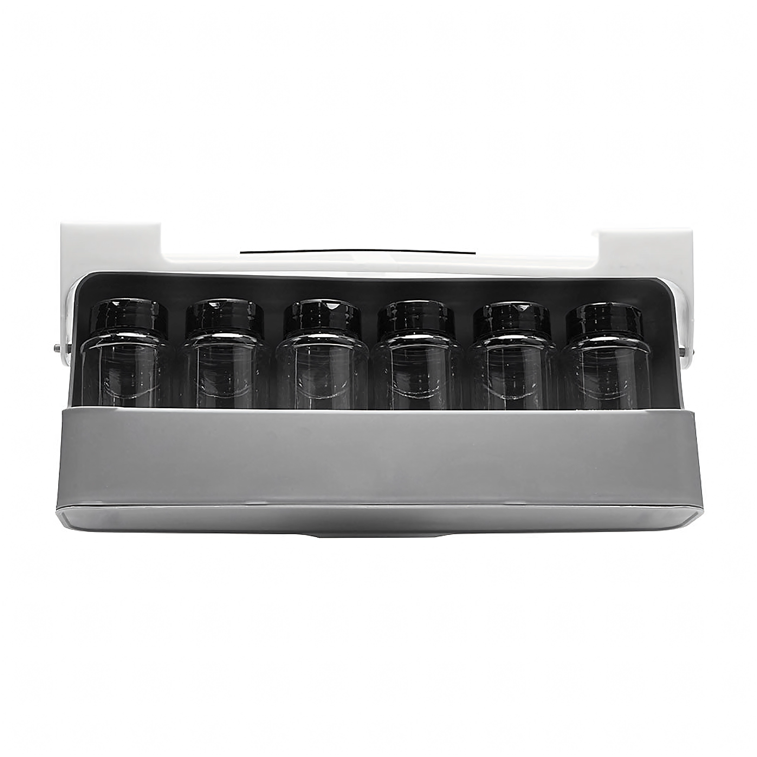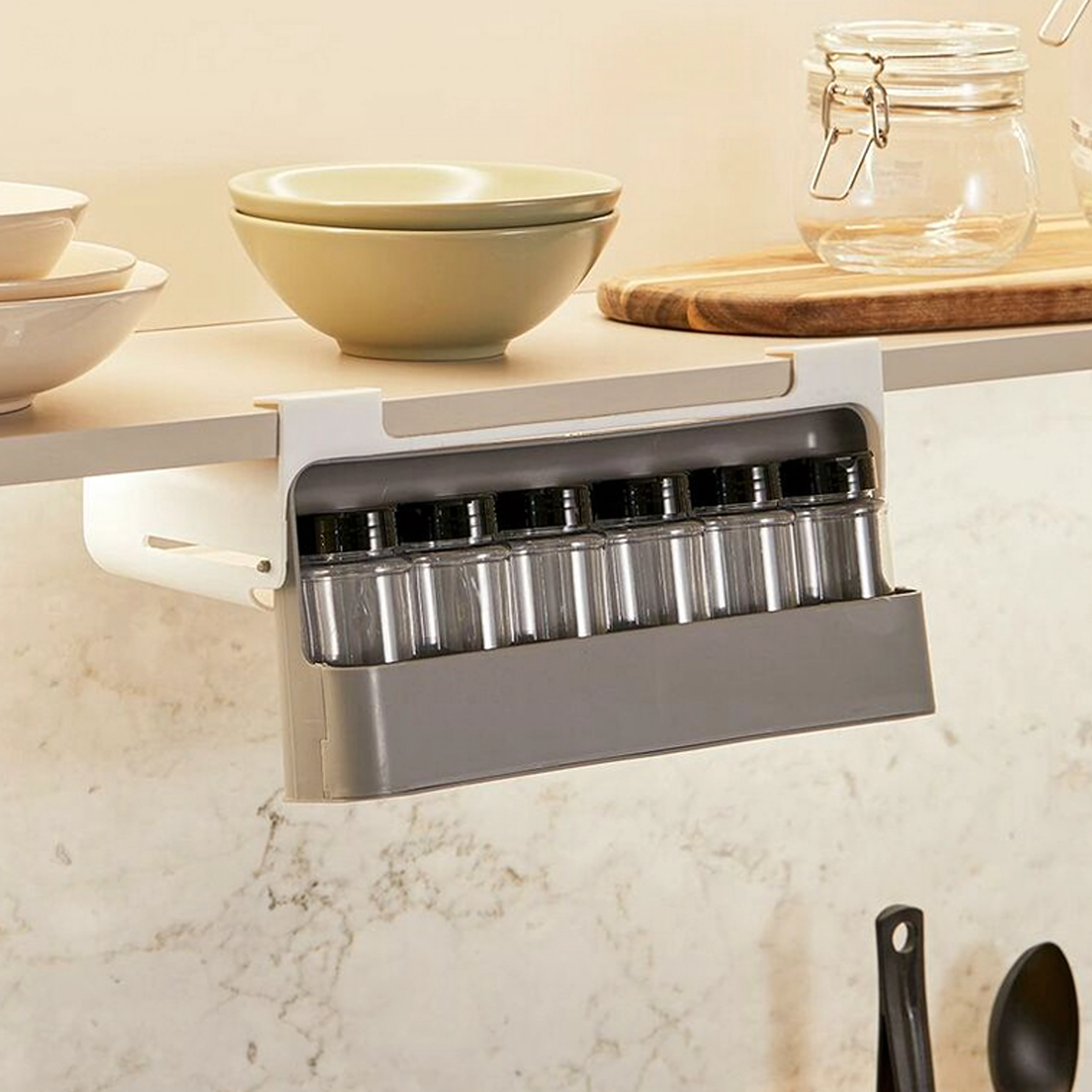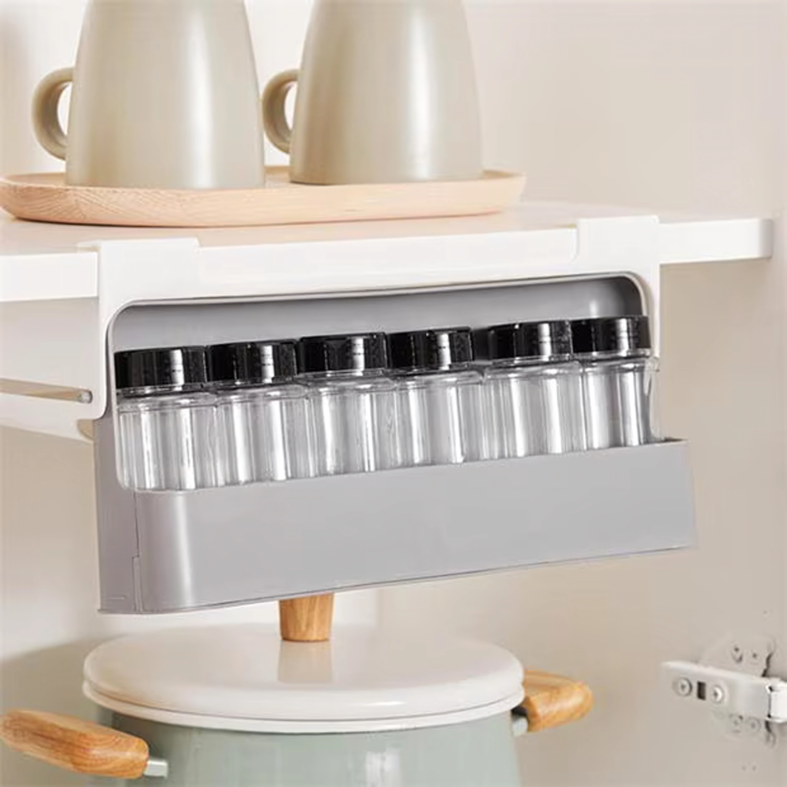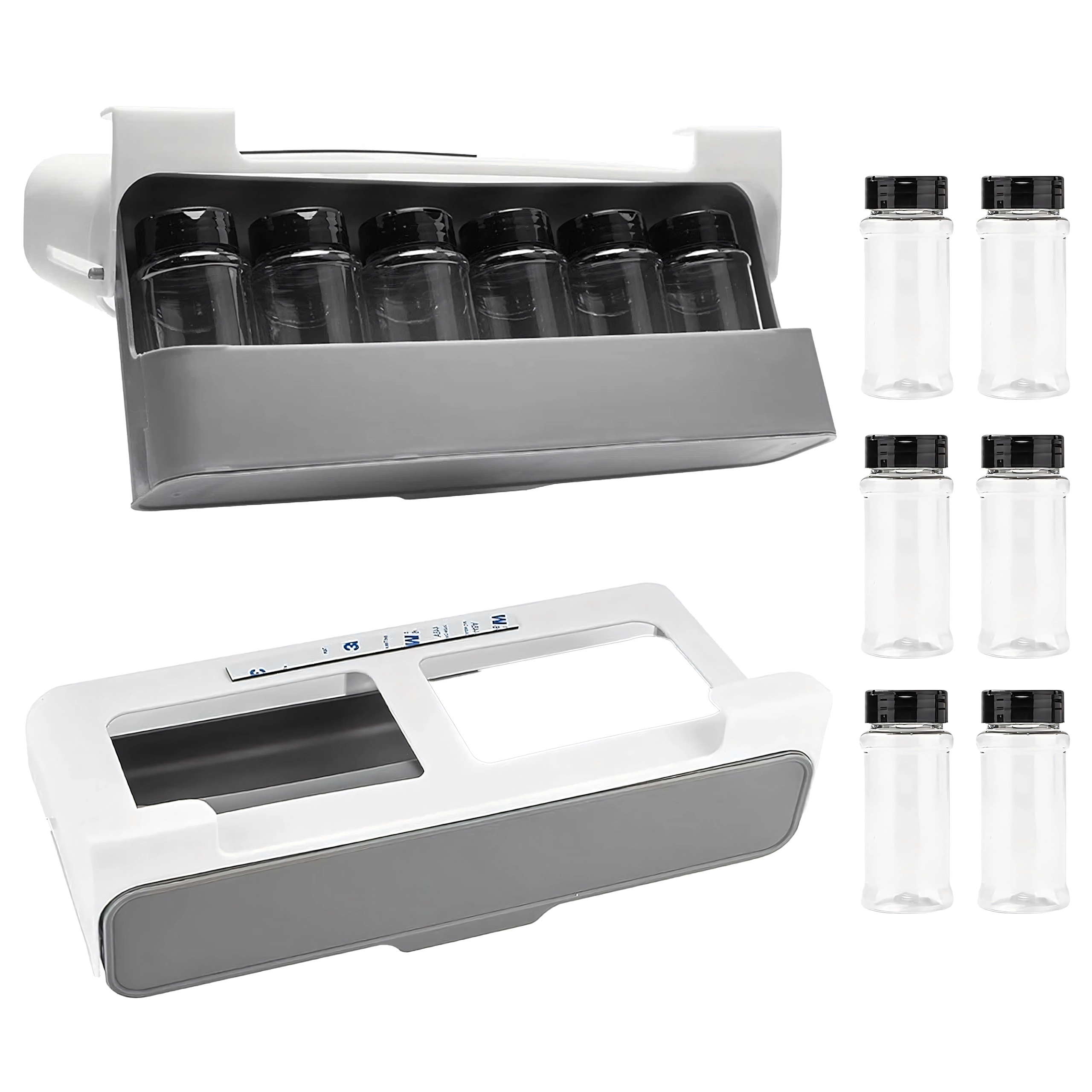 Sešas caurspīdīgas stikla burciņas ar melniem vāciņiem uztur garšvielas svaigas un tīras. Minimalistisks balti pelēks dizains iederas gan modernās, gan klasiskās virtuvēs un efektīvi izmanto vietu zem plaukta vai skapītī.