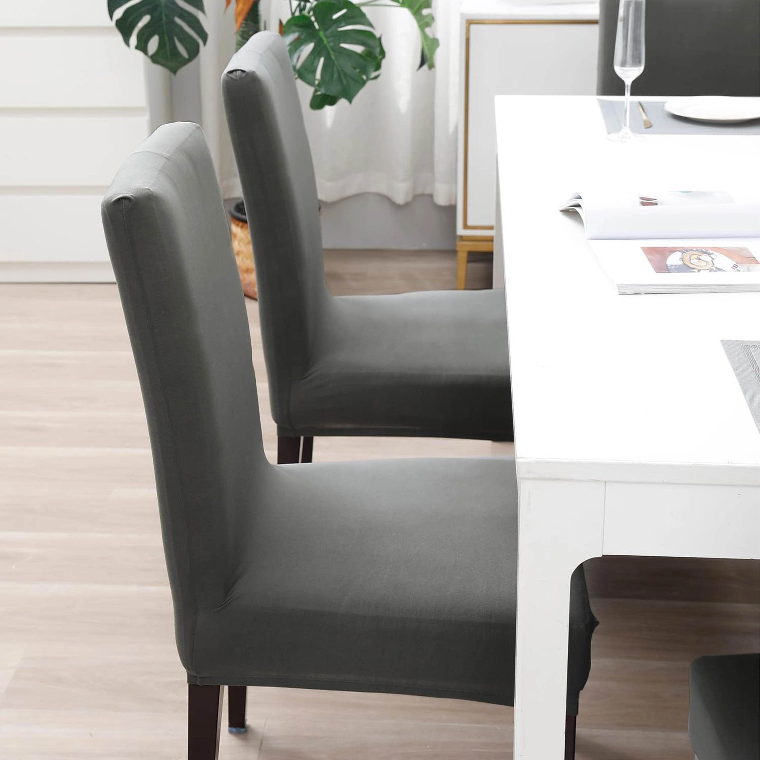Praktiski un eleganti sēdvirsmu pārvalki uzreiz atjauno vecāku krēslu izskatu un pagarina to kalpošanas laiku. Elastīgais materiāls (90% poliesters, 10% elastāns) nodrošina ciešu piegulumu bez burzīšanās un bez gludināšanas. Universālā pelēkā krāsa viegli saskaņojama ar lielāko daļu interjeru – no ēdamistabas līdz birojam.