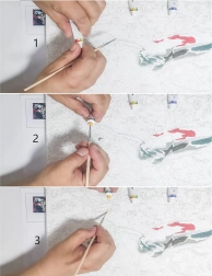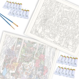 Komplektā iekļautās akrila krāsas ar labu sedzamību vienmērīgi aizpilda laukumus un izceļ motīva detaļas.