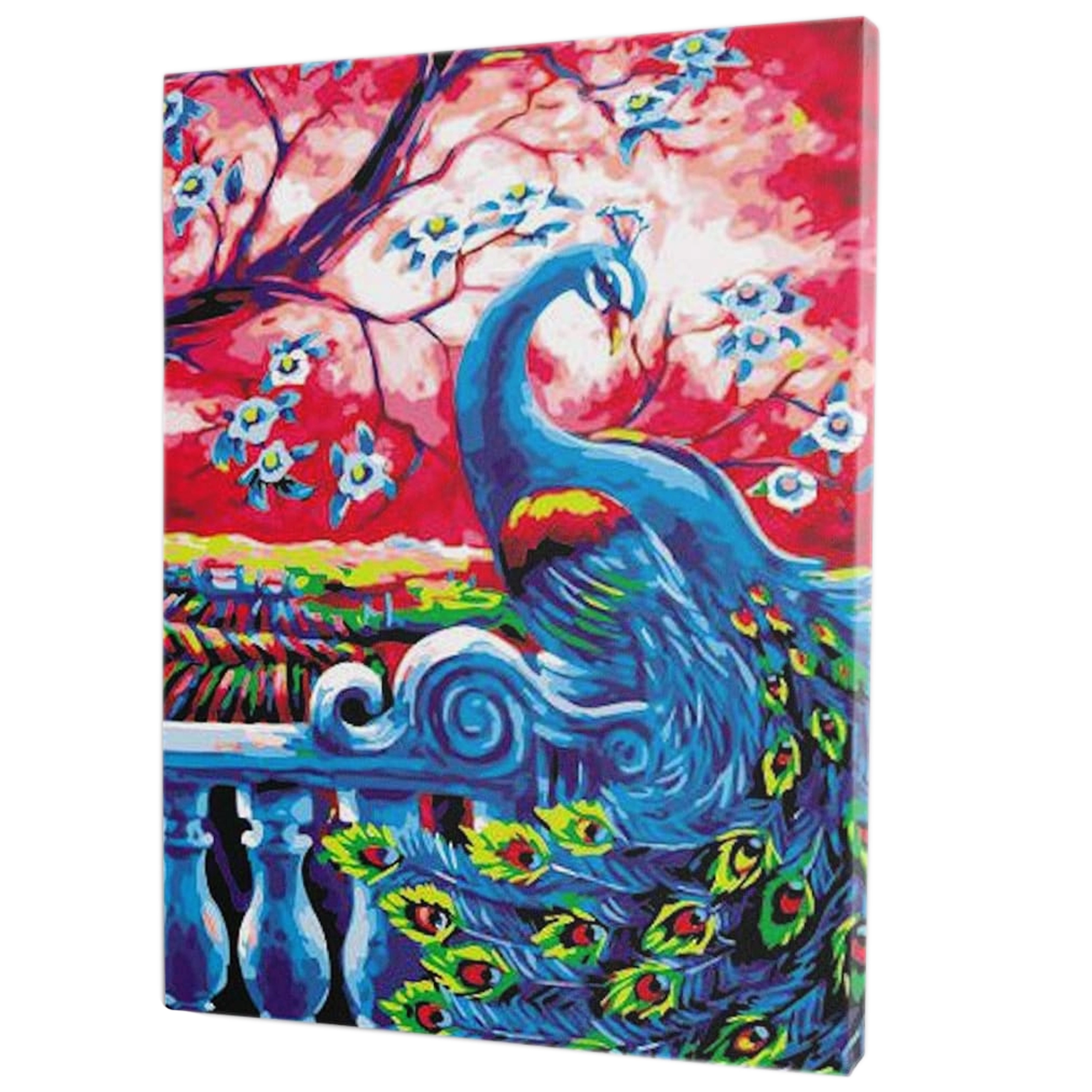 Pilns komplekts ar audeklu uz rāmja, krāsām un otām. Pabeigtu gleznu ar pāva motīvu varat uzreiz pakarināt.