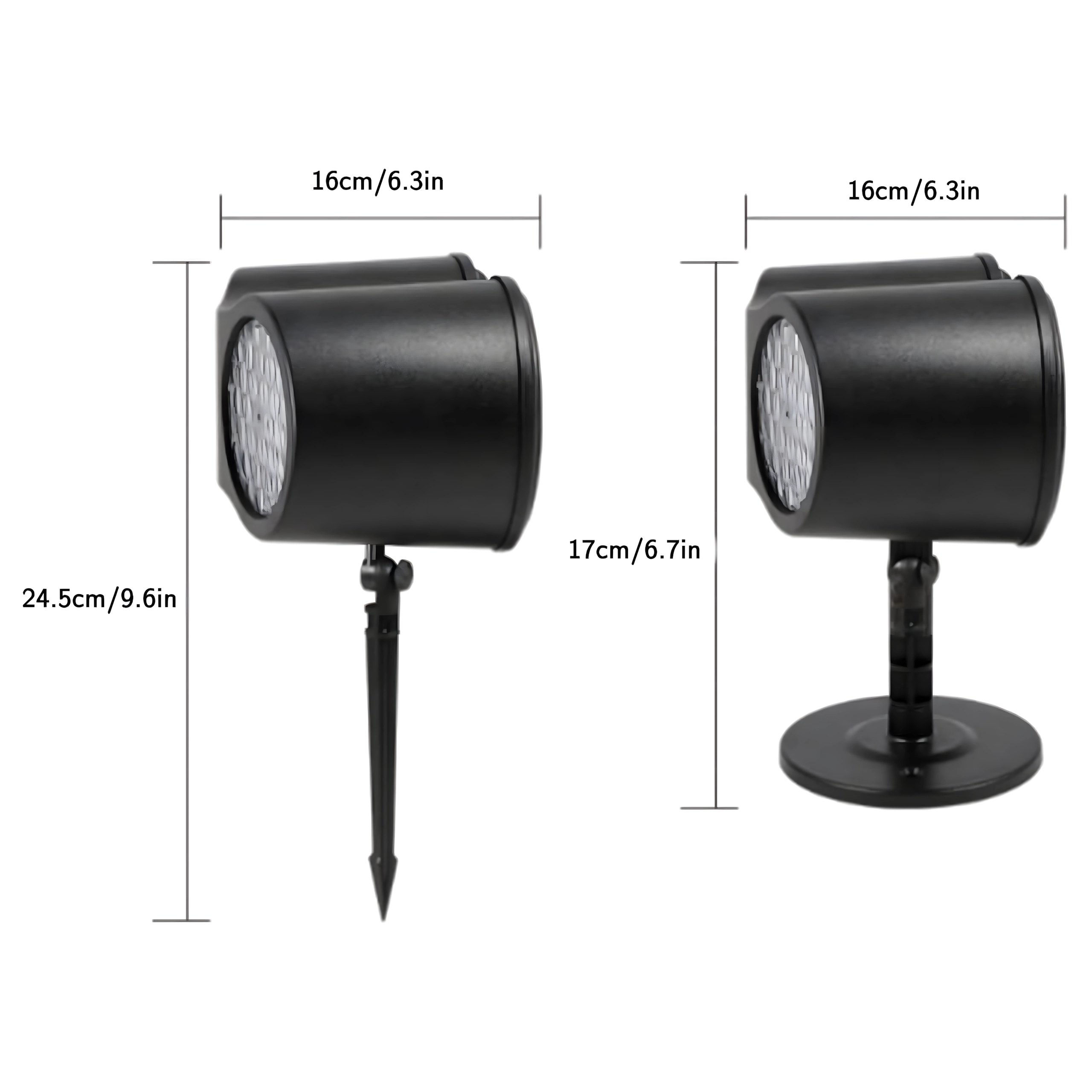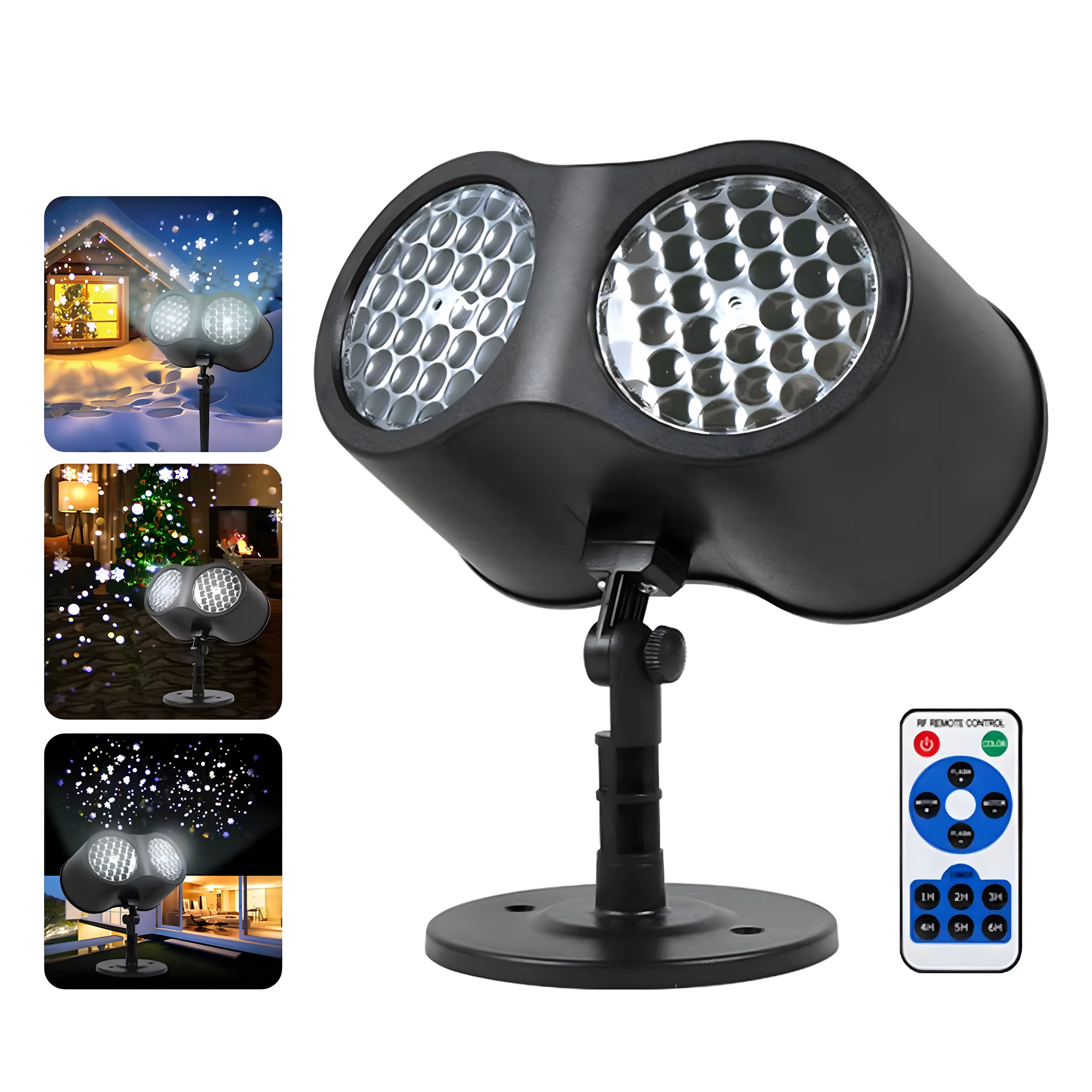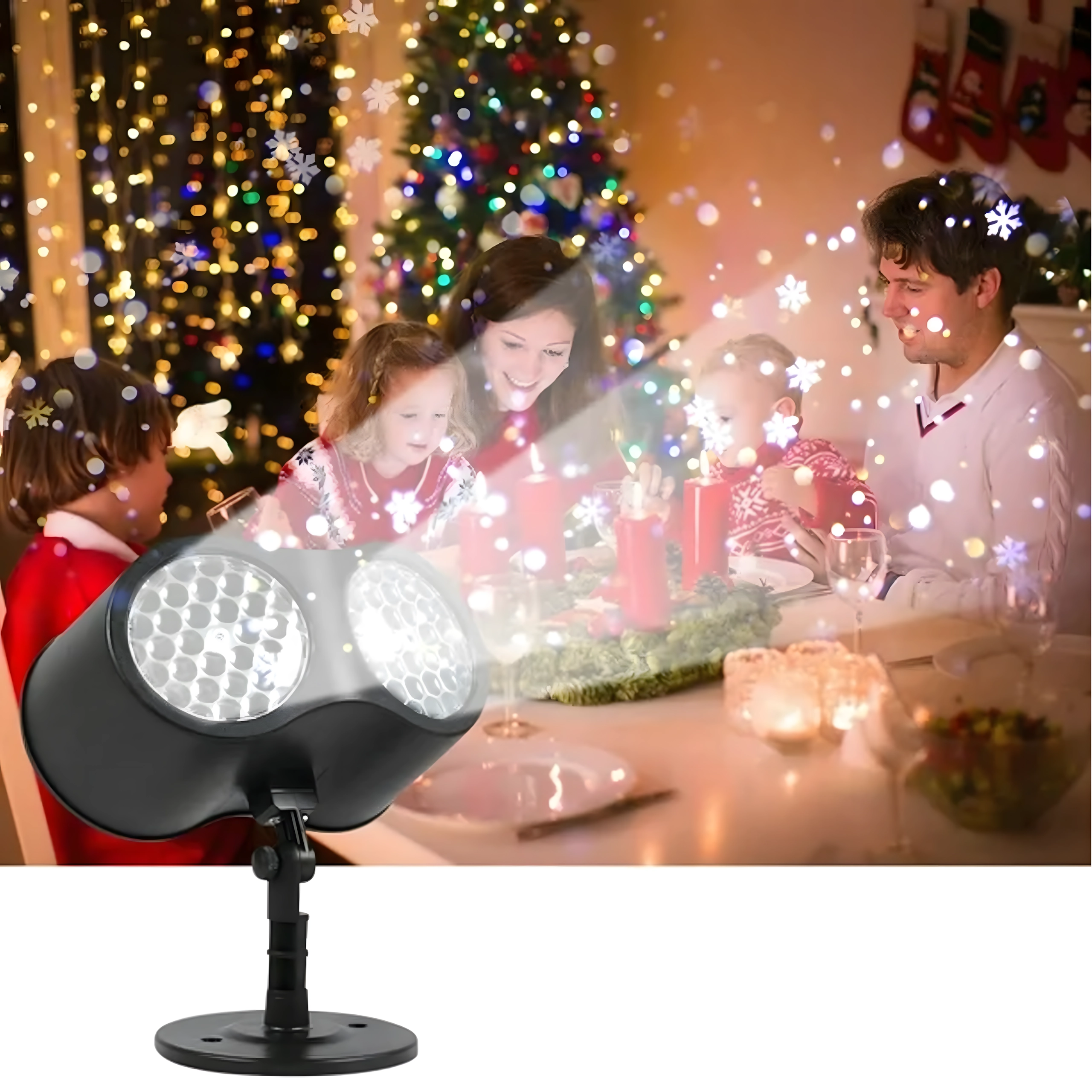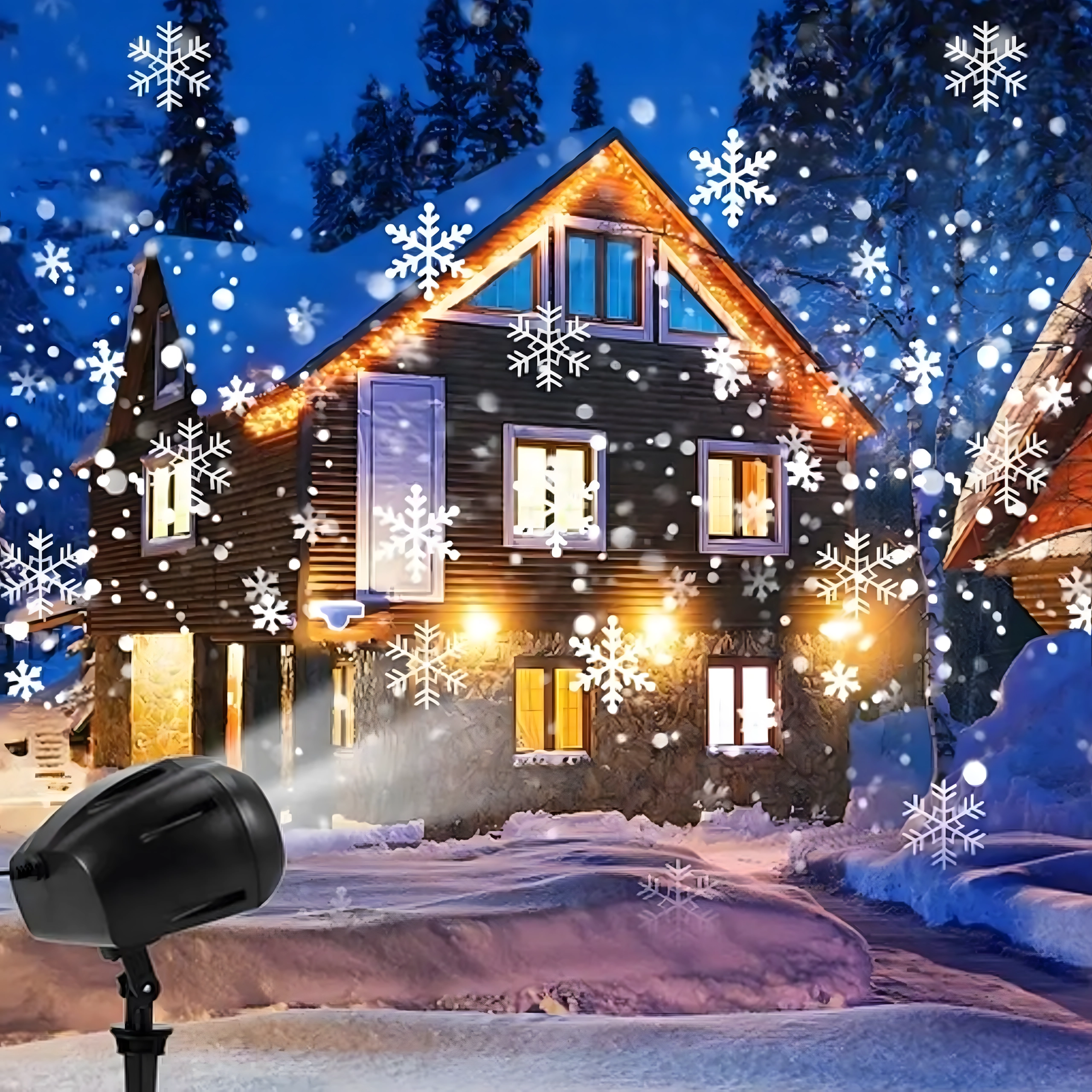 Divkāršā LED optika projicē spilgtas, dinamiskas pārslas un punktus pāri lielām sienu un fasāžu virsmām – ideāli ātrai svētku dekorēšanai bez kāpnēm un virtenēm.