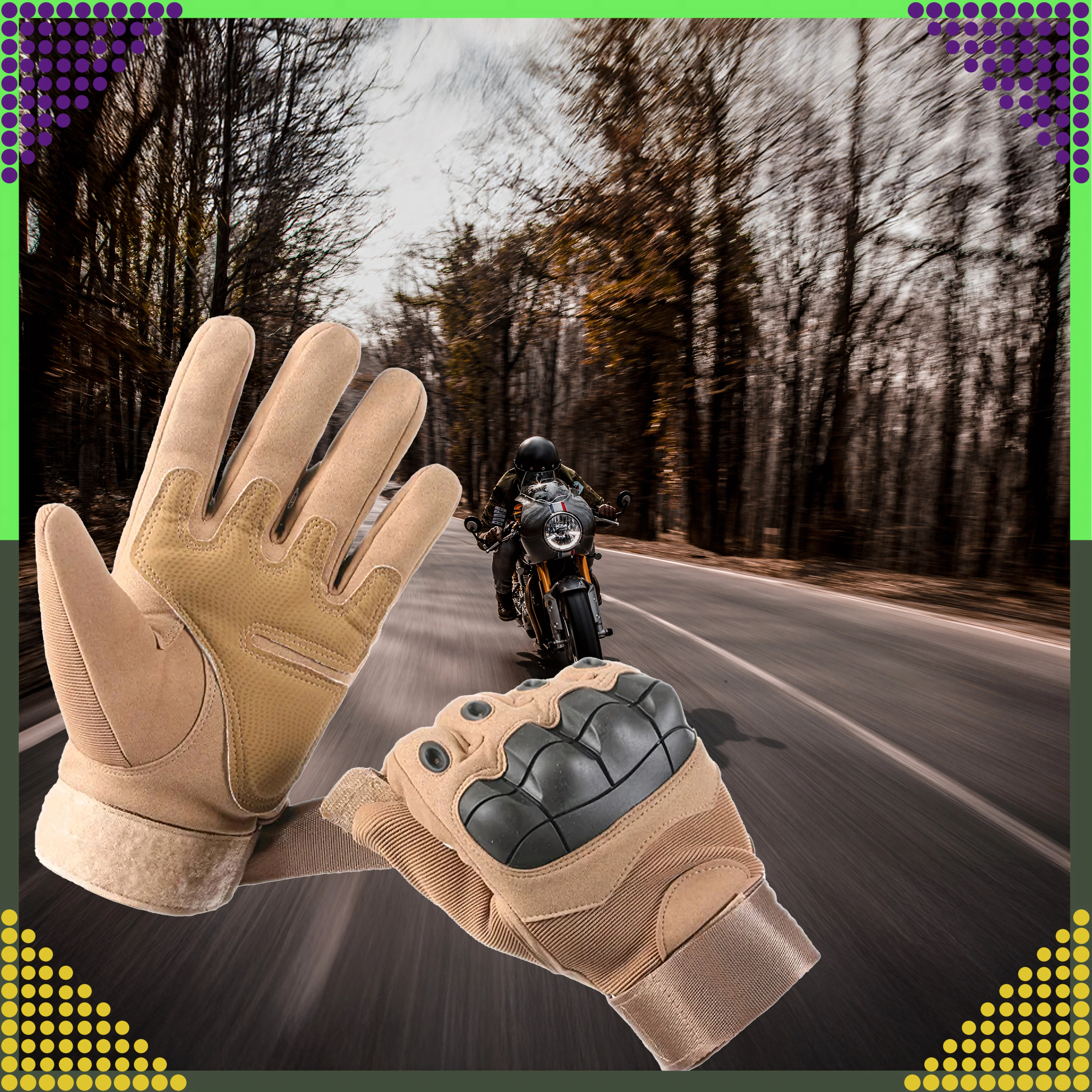 - Aizsardzība un izturība: cieti locītavu aizsargi, pastiprinātas plaukstas zonas