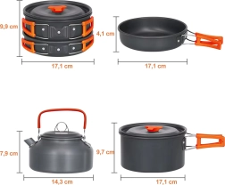 Komplekts ir piemērots ēdiena gatavošanai uz pārnēsājama gāzes degļa un ūdens uzsildīšanai tējkannā. Nepiedegošā virsma atvieglo gan gatavošanu, gan tīrīšanu.