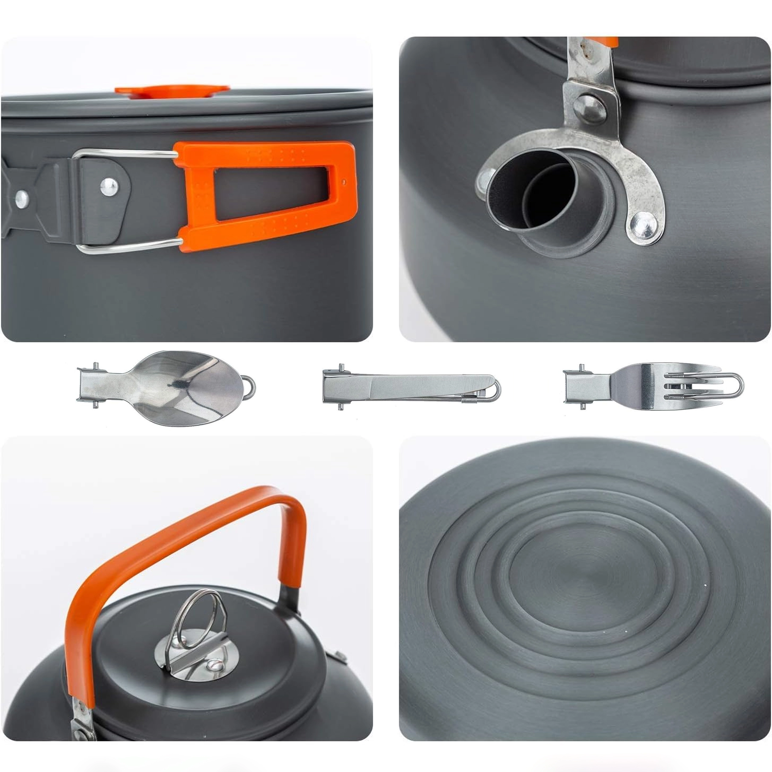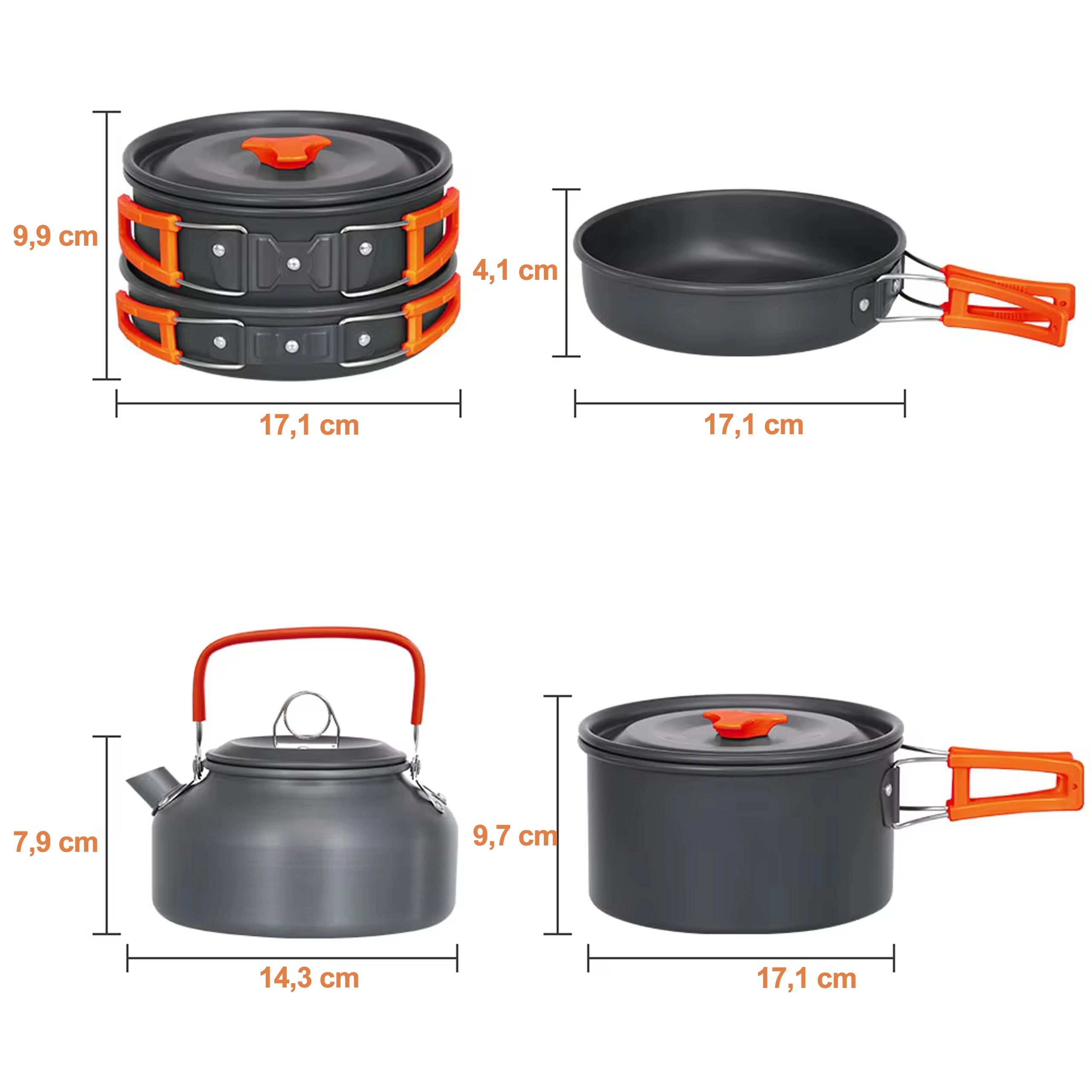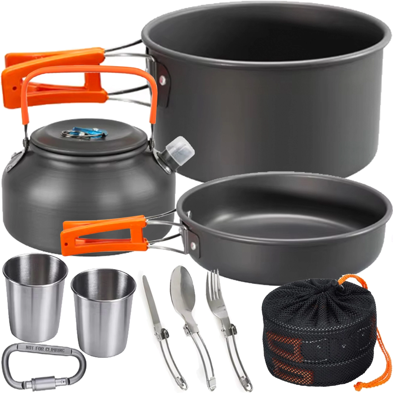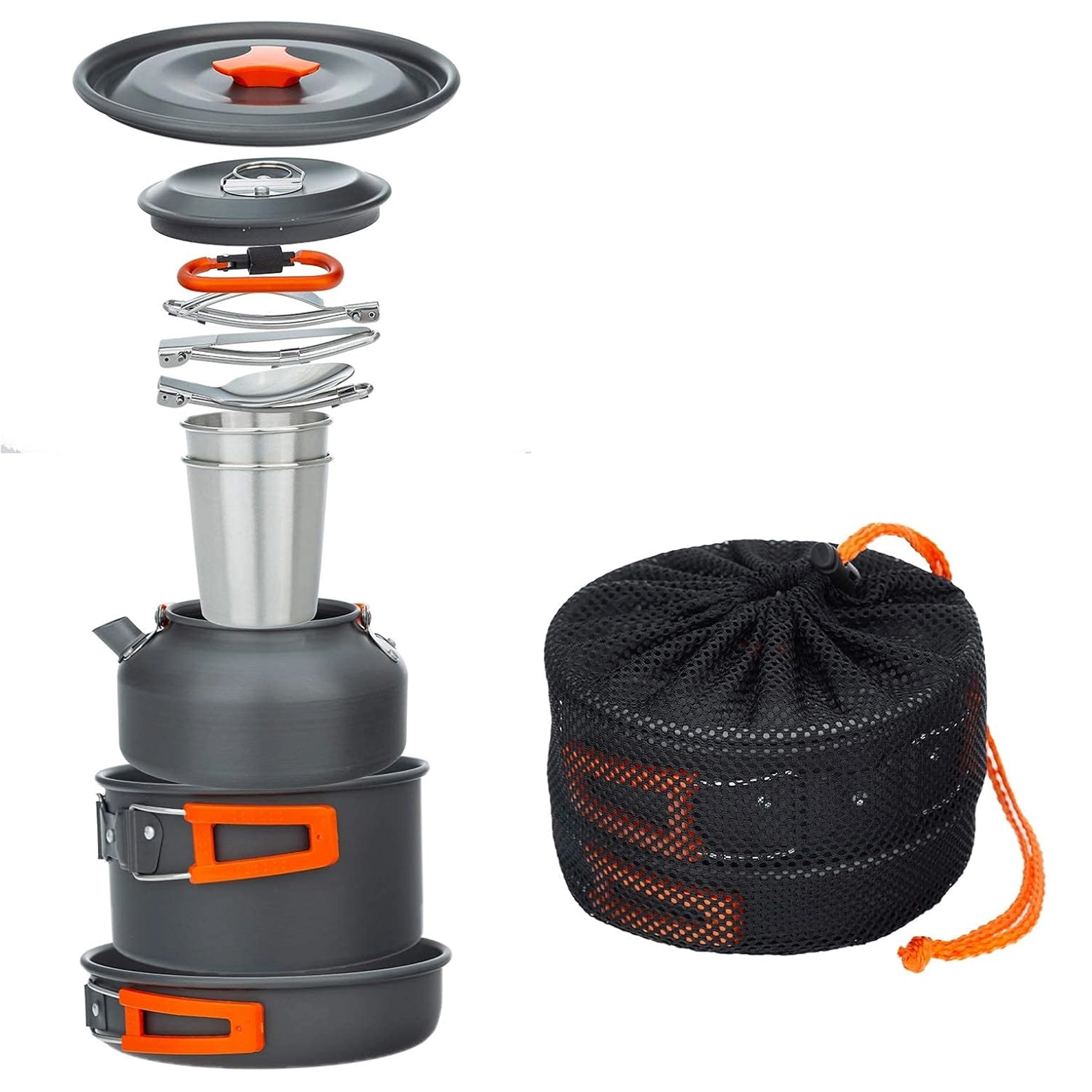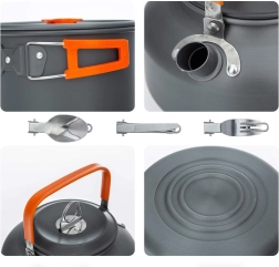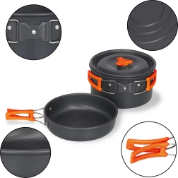 Praktisks un viegls kempinga trauku komplekts 2 personām ar katlu, pannu, tējkannu un piederumiem. Pateicoties salokāmiem rokturiem, kompaktai salikšanai vienā un izturīgai nerūsējoša/metāla konstrukcijai tas ir ideāli piemērots kempingam, pārgājieniem un ceļošanai. Komplektā ir arī krūzītes un tīkliņveida maisiņš ērtai pārnēsāšanai.