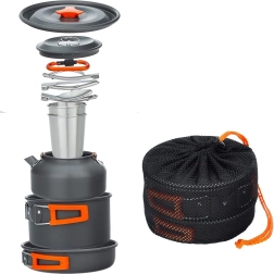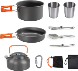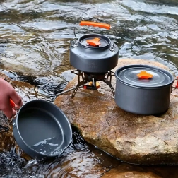 Šis universālais kempinga trauku komplekts piedāvā visu, kas nepieciešams ērtai gatavošanai dabā. Katls ar vāku, panna un tējkanniņa nodrošina uzticamu bāzi vārīšanai, cepšanai un ūdens uzsildīšanai. Pateicoties salokāmiem karstumizturīgiem rokturiem un gudrai salikšanas (nesting) sistēmai, viss komplekts viegli ietilpst mugursomā.