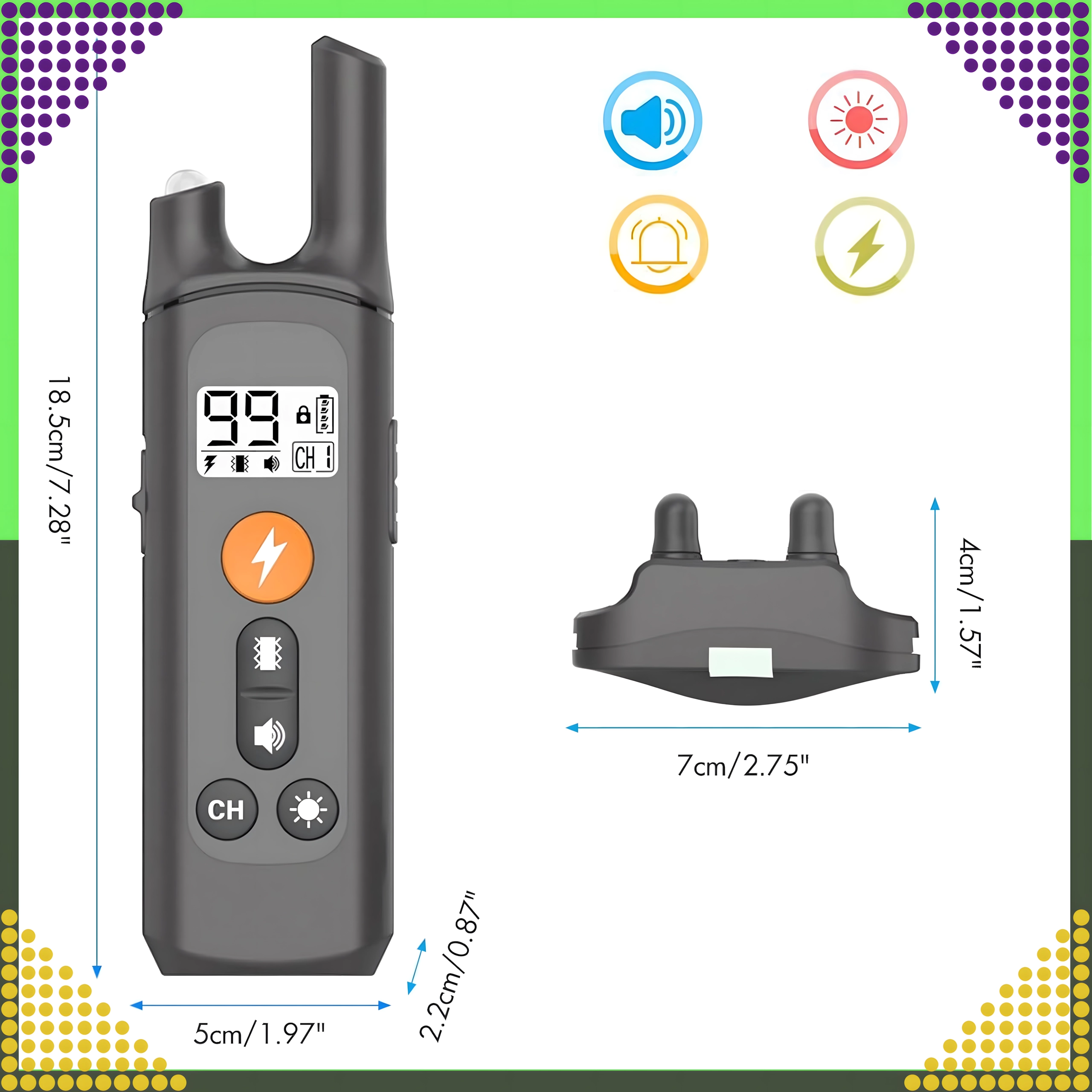 Četri režīmi – impulss, vibrācija, gaisma un skaņa – palīdz saudzīgi koriģēt nevēlamu uzvedību, mazināt riešanu vai aizbēgšanu un stiprināt ikdienas paklausību. Regulējama siksna (līdz aptuveni 70 cm) der lielākajai daļai šķirņu.