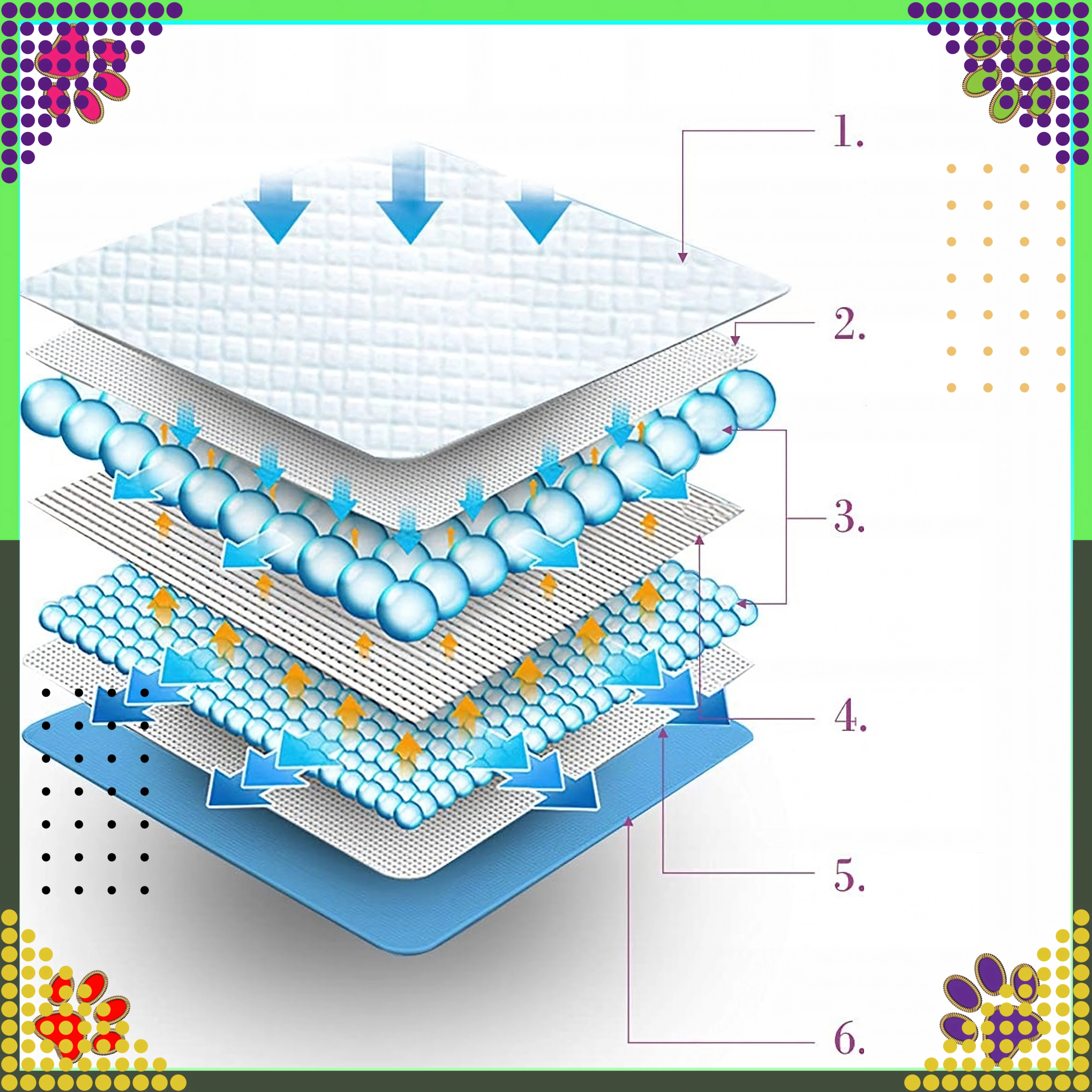 Uzlabota konstrukcija ar absorbējošām gēla pērlēm un necaurlaidīgu apakšējo plēvi ātri izkliedē un noslēdz šķidrumu, lai virsma paliktu sausa.