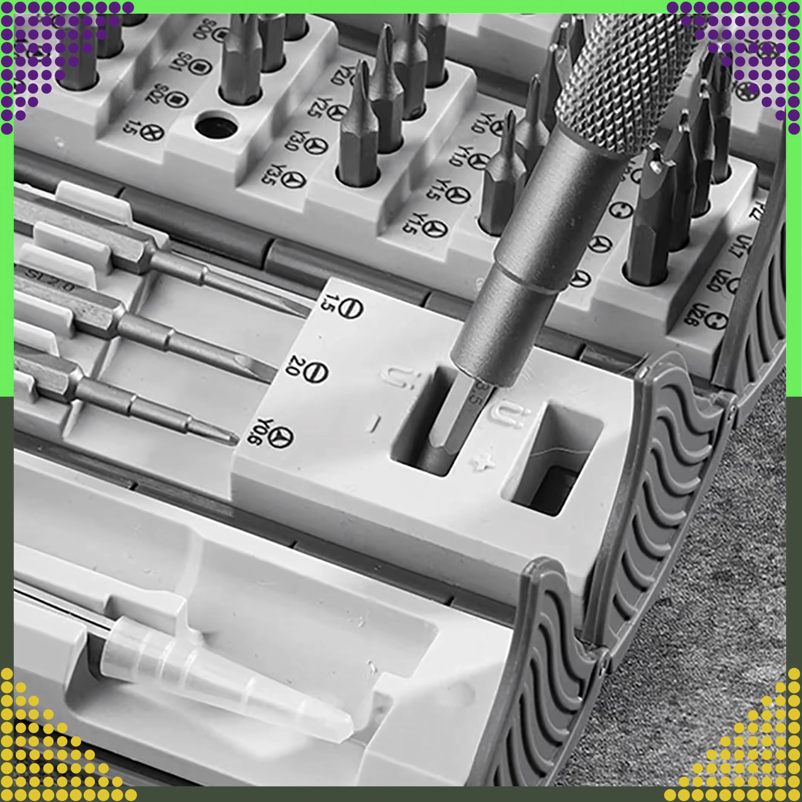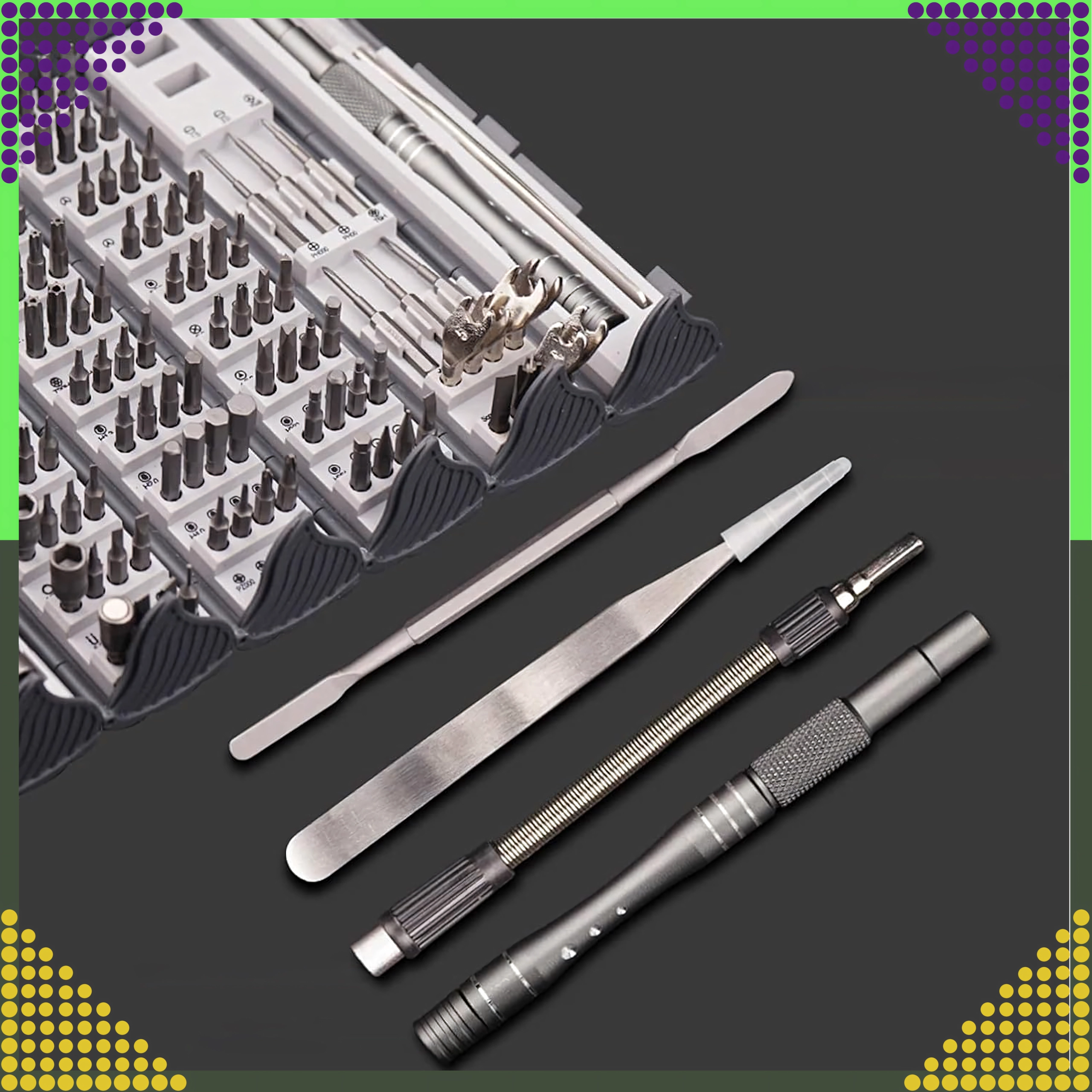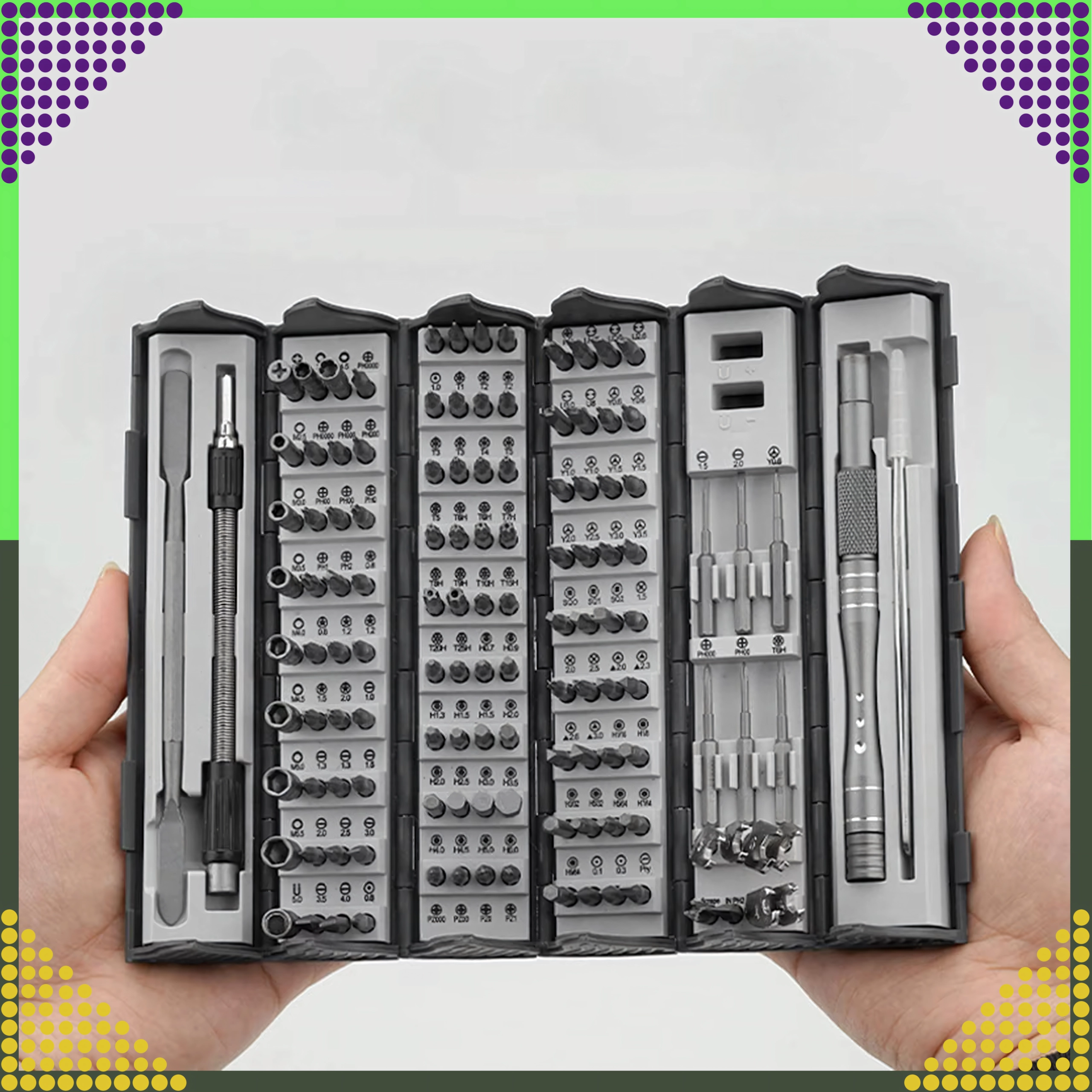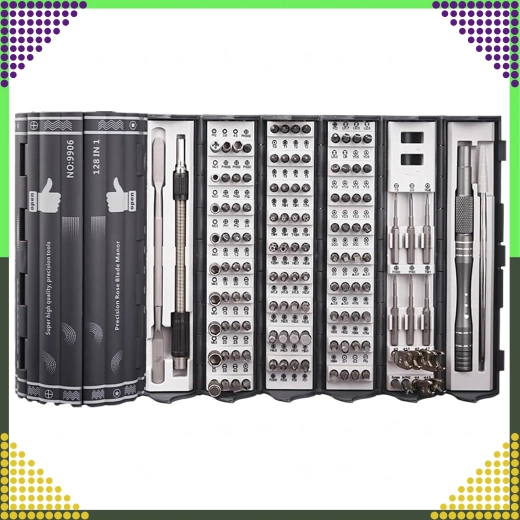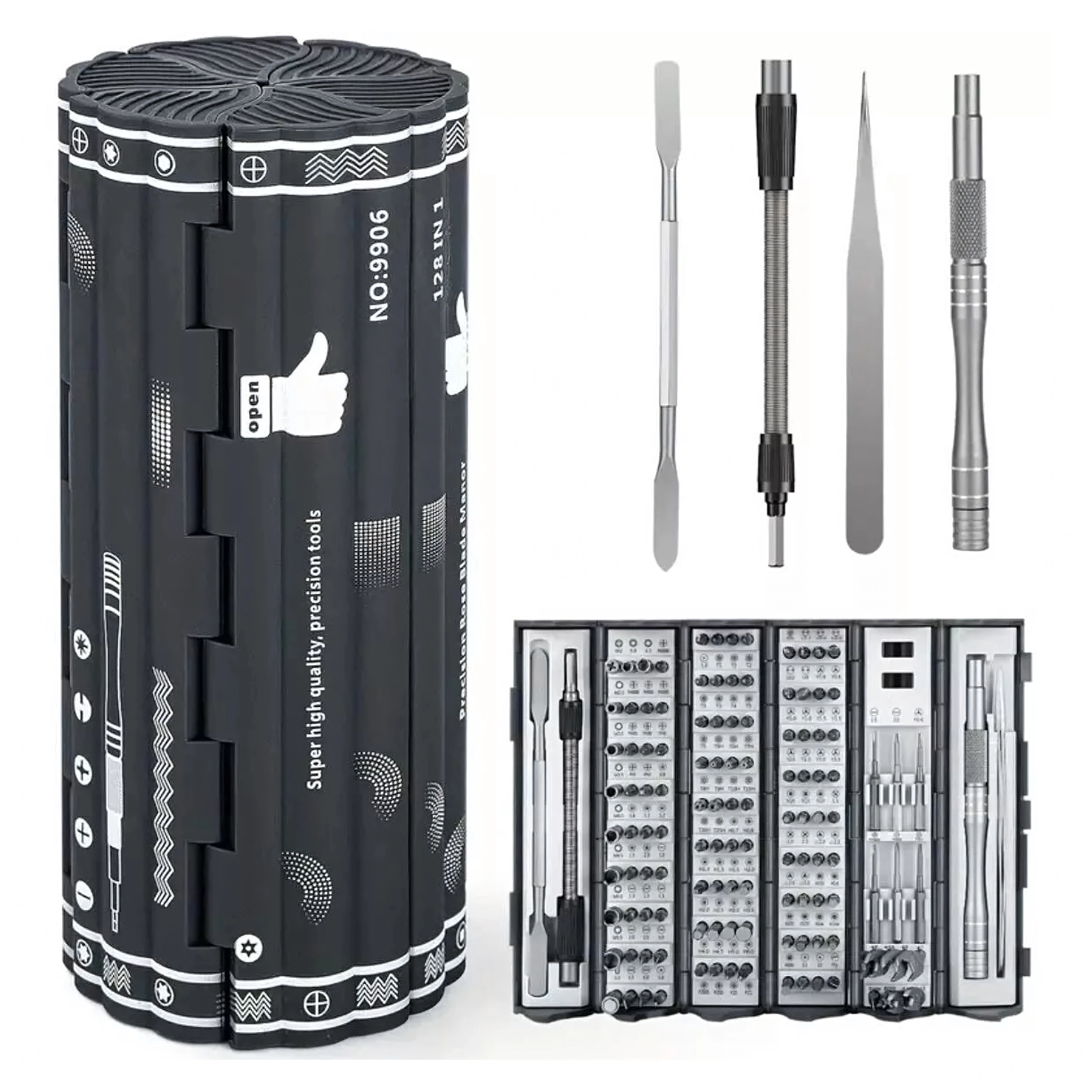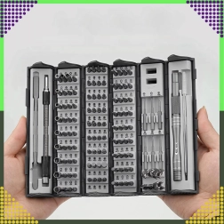 Atklājiet maksimālu ērtumu un daudzpusību ar skrūvgriežu un uzgaļu komplektu 128 vienā. Pateicoties magnētiskajām uzgaļu galiņām, ergonomiskajiem rokturiem un plašam bitu klāstam, tas ir ideāli piemērots elektronikas remontam, viedtālruņiem, klēpjdatoriem, brillēm un smalkiem mehāniskajiem mehānismiem.