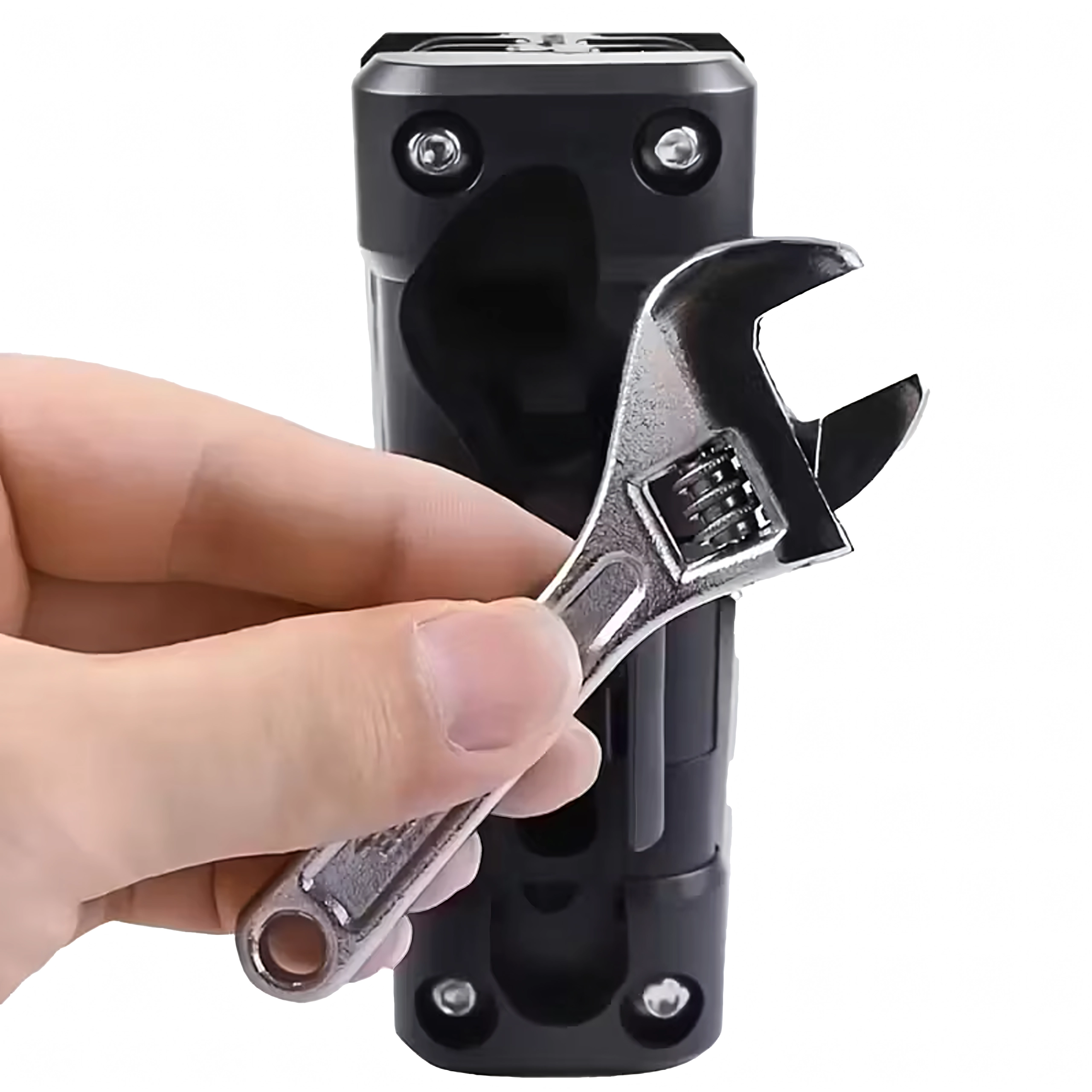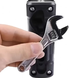 Integrētā regulējamā atslēga palīdz ar dažādu izmēru uzgriežņiem un skrūvēm bez papildu instrumentiem.