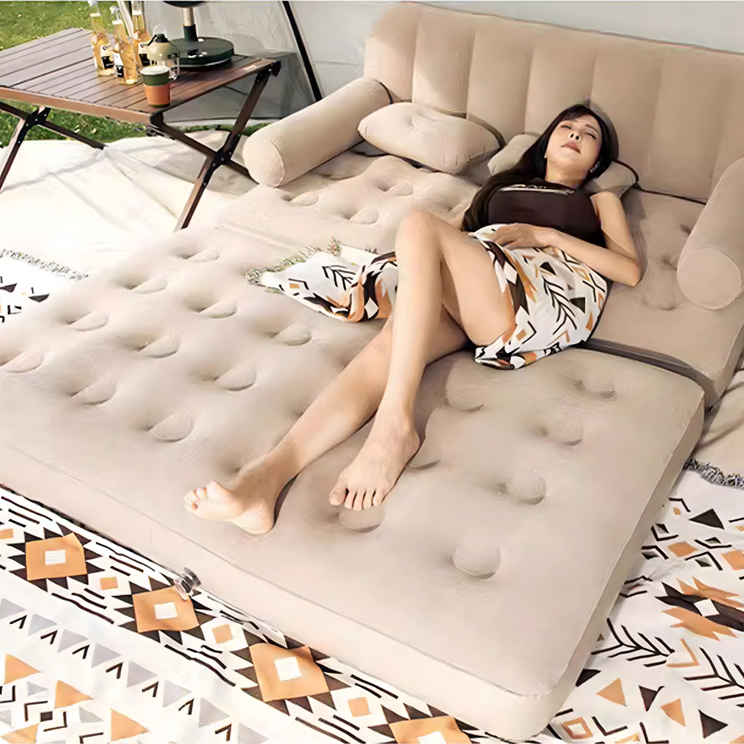 Ērta sēdēšana viesistabā, atpūta terasē un komfortabla gulēšana kempingā. Bēšais dizains iederas jebkurā vidē.