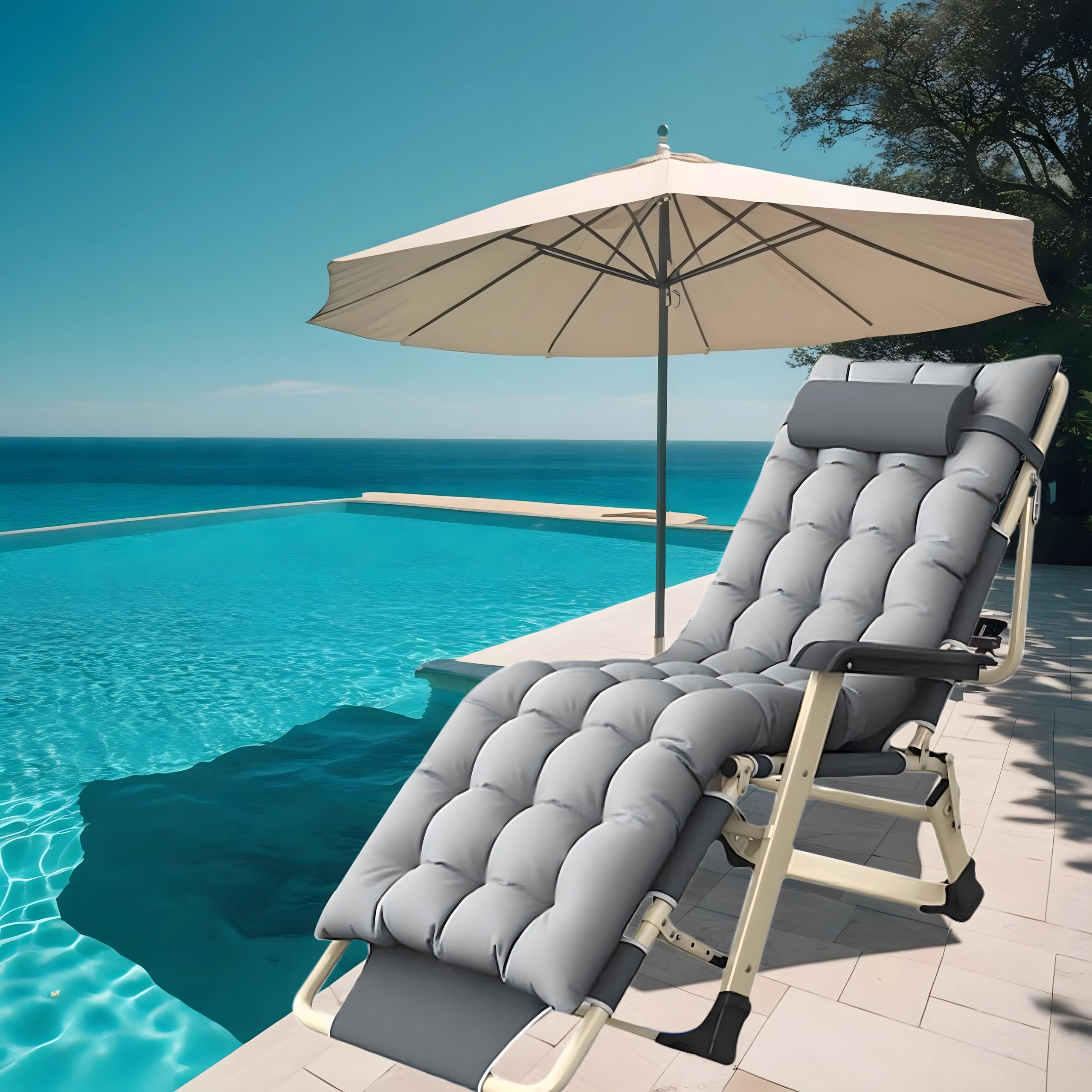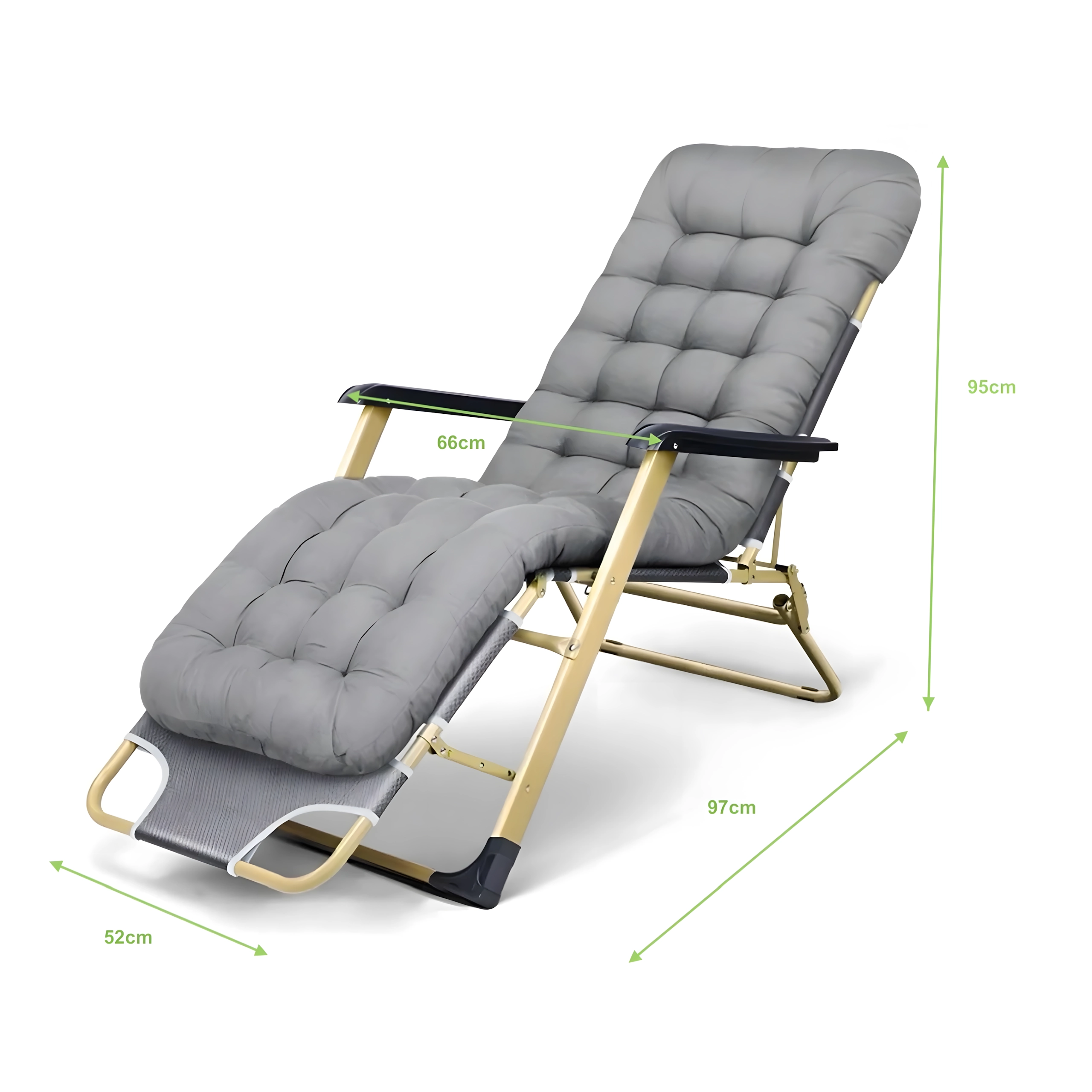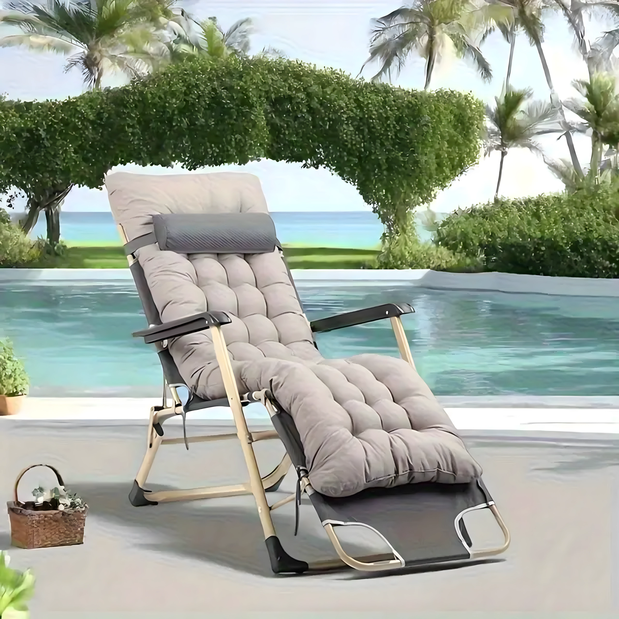 Mīksts, stepēts sēdeklis ar galvas spilvenu un izturīga metāla konstrukcija ar roku balstiem nodrošina ērtumu un stabilitāti lietošanai ārpus telpām.