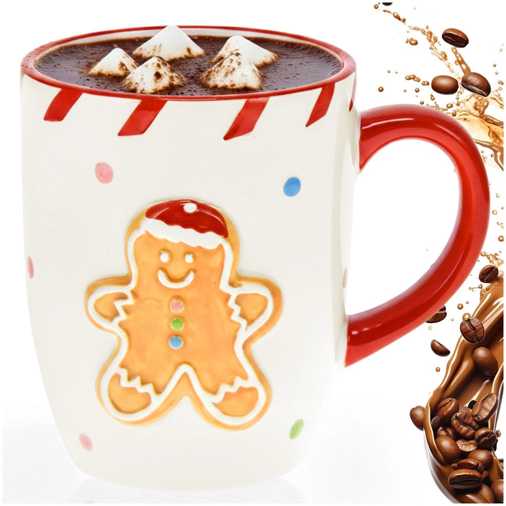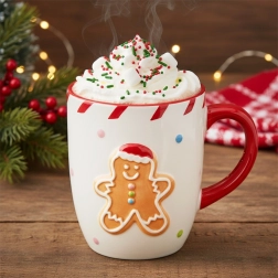 Mīlīga Ziemassvētku krūze ar piparkūku vīriņa motīvu un kontrastējošu sarkanu rokturi ir ideāli piemērota ikdienas tējas, kafijas vai kakao dzeršanai. Tai ir 330 ml tilpums, ērti veidots rokturis un kvalitatīva keramika, kas labi notur siltumu. Pateicoties svētku dizainam, tā ir lieliska dāvana ziemas sezonai un stilīgs aksesuārs karstiem dzērieniem vēsos vakaros.