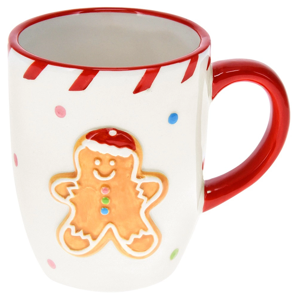 Reljefs piparkūku vīriņš un krāsaini punktiņi rada mājīgu Ziemassvētku noskaņu pie katras krūzes.