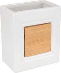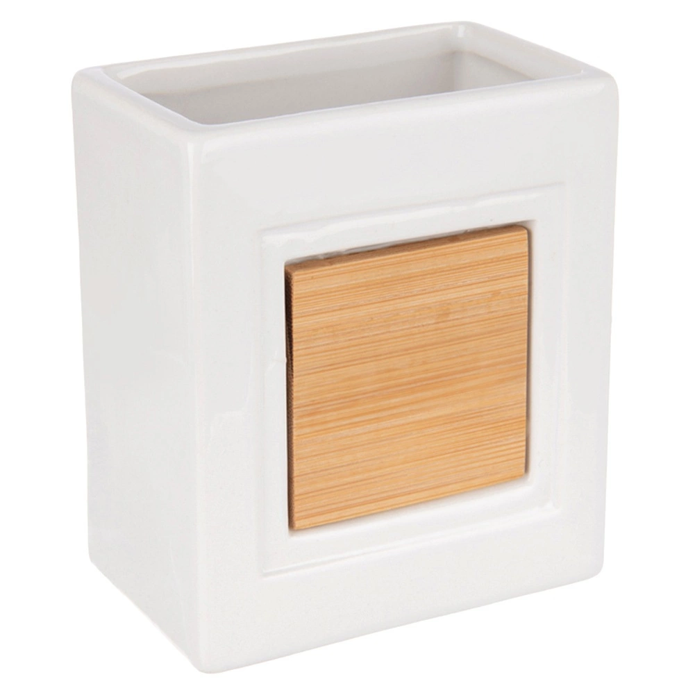 Spīdīgi balta virsma ar bambusa paneli izskatās eleganti un tur zobu birstes un sīkumus pa rokai.